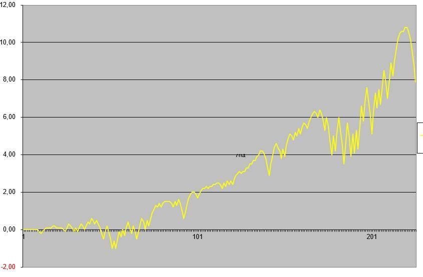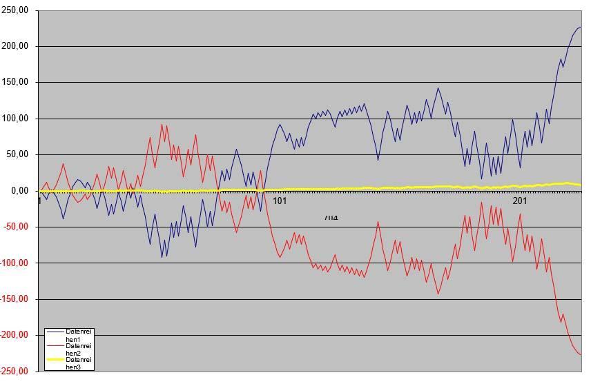 Liebe Chris, ganz bewusst erwähnte ich mit keiner Silbe das Roulette in meiner kleinen Zahlenspielerei. Mir schwebte ein Glücksrad mit lauter 1 und – 1 Fächern vor, in gleicher Anzahl. Wie viele es sind, ist belanglos. Es kann 2 × 18, 2 × 74 sein. Hoffentlich spielt es für dich keine Rolle. Du stehst vor dem Glücksrad, mit deinen Signalen in der Hand (die Ergebnisse vom Vortag schon in der Nacht memoriert) und wartest fünf Drehungen ab, um eine Brücke von der Vergangenheit in die Zukunft schlagen zu können. Wie ist der Erwartungswert nach fünf Drehungen, deiner Meinung nach? Ich wünsche dir ebenfalls einen wundervollen Sonntag. Laszlo P.S. Der gute Goliath kann höchstens seine Sauteuse in den Griff bekommen. Was glaubst du, kann er das ohne Brandwunden bewerkstelligen? -