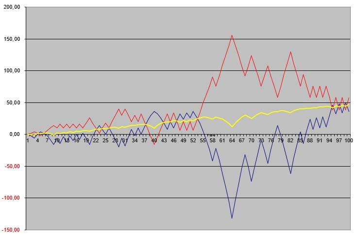 @Egon Wie kannst Du bloß so kleinmütig sein, dass Du meinst, ein echtes Nullsummenspiel nicht zu schlagen wäre? Hast Du schon probiert? Dann war dein Instrumentarium mangelhaft. Ich habe in 25 Jahren verschiedene Konzepte kreiert, alle sind in der Lage, ein 50:50 Spiel mit Plus abzuschließen, mit festem Tischlimit und Budget. Zeitaufwand sollten wir großzügig als nebensächlich betrachten. Daraus folgt, dass auf empirischer Grundlage muss ein +EW vorhanden sein, auch wenn es mit mathematischen Formeln noch nicht bewiesen ist. Prozentuelle Vorteile interessierten mich aber nicht, weil ich nicht beabsichtigte damit Geld zu verdienen. Es war eine Denksportaufgabe, sonst nichts. Wenn mir nicht glauben kannst, denke an Billedivoire. Eine Möglichkeit die Kugel zu schlagen sind die Differenzspiele. Er hatte recht. Übrigens, das abgebrochene Spiel habe ich später fortgesetzt, zwei kleineren Aufwärtsschwünge und viele Coups in die Breite brachten das logische Resultat. Zugegeben, die Beträge, ob positiv oder negativ, bringen keine gravierenden Änderungen in meine Vermögensverhältnisse. Nur die Genugtuung, „ein bissel was geht immer“. -