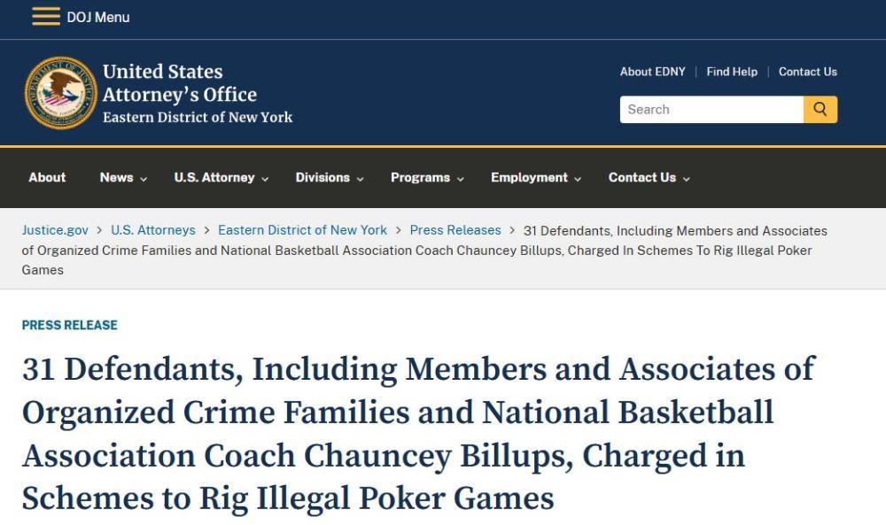 31 Angeklagte, darunter Mitglieder und Komplizen organisierter Verbrecherfamilien und der Trainer der National Basketball Association, Chauncey Billups, wegen Manipulation illegaler Pokerspiele angeklagt. Die Angeklagten sollen drahtlose Technologie eingesetzt haben, um bei Kartenspielen mit hohen Einsätzen zu betrügen. „Wie behauptet, haben Mitglieder und Komplizen organisierter Verbrecherfamilien (Bonnano, Gambino, Luchesse and Genovese) illegale Pokerspiele manipuliert, um im Rahmen eines hochentwickelten und lukrativen Betrugsplans Opfer um Millionen von Dollar zu betrügen, und sich mit anderen verschworen, um ihre Betrügereien zu begehen“, erklärte der US-Staatsanwalt Nocella. „Bekannte ehemalige NBA-Spieler und ehemalige Profisportler fungierten als ‚Bildkarten‘, um ahnungslose Opfer zu Pokerspielen mit hohen Einsätzen zu locken, wo sie dann versteckten Technologien ausgeliefert waren, darunter manipulierte Mischmaschinen und speziell entwickelte Kontaktlinsen und Sonnenbrillen, mit denen die Rückseiten der Spielkarten gelesen werden konnten, was sicherstellte, dass die Opfer hohe Verluste erlitten. Die heutige Anklage und Verhaftung läutet das endgültige Aus für diese Betrüger ein.“ Das „endgültige Aus“, ja, gewiss. Vorsicht in illegalen "speakeasies".