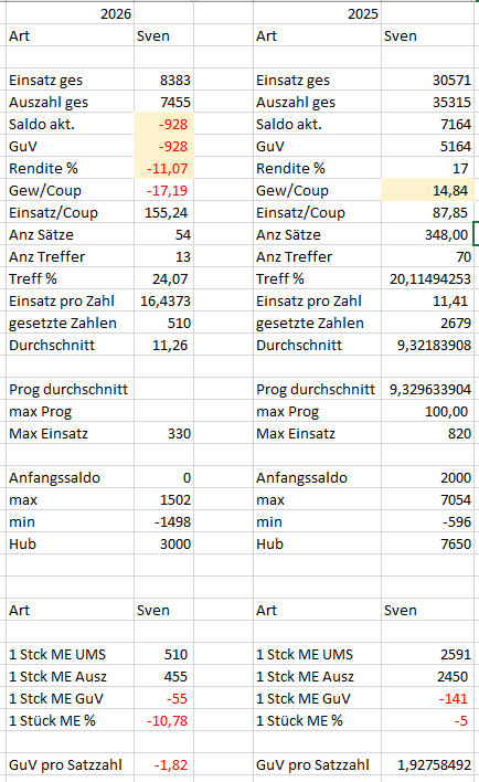 Art Sven 36er Einsatz ges 8383 8383 Auszahl ges 7455 7668 Saldo akt. -928 -715 GuV -928 -715 Rendite % -11,07 -8,53 Gew/Coup -17,19 -13,24 Einsatz/Coup 155,24 Anz Sätze 54 54 Anz Treffer 13 Treff % 24,07 Einsatz pro Zahl 16,4373 -