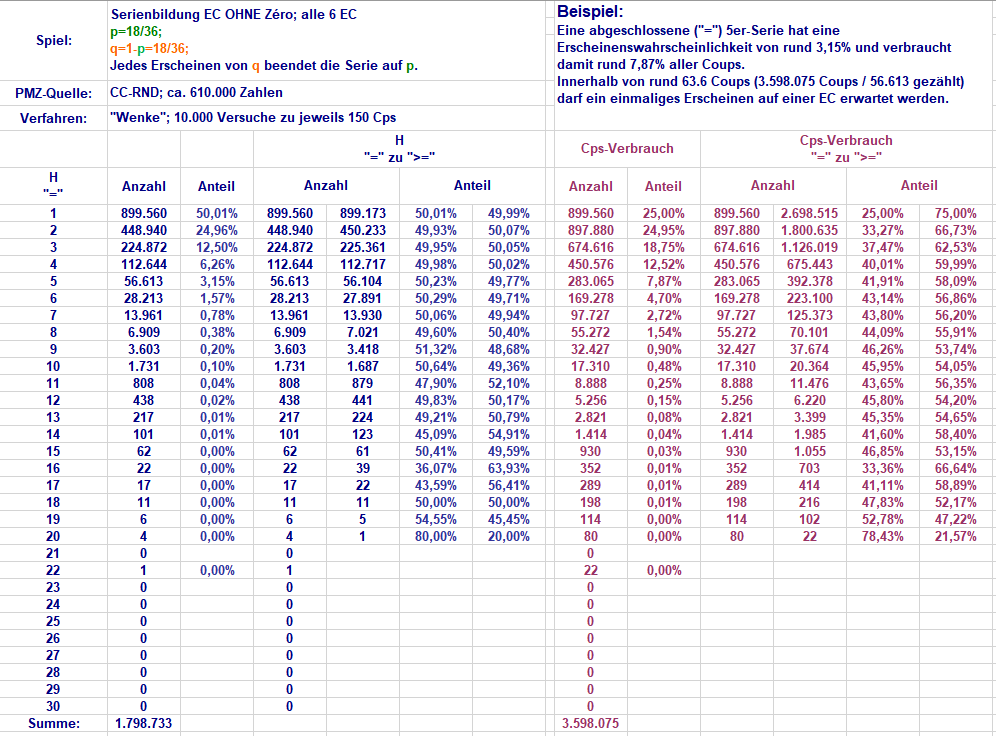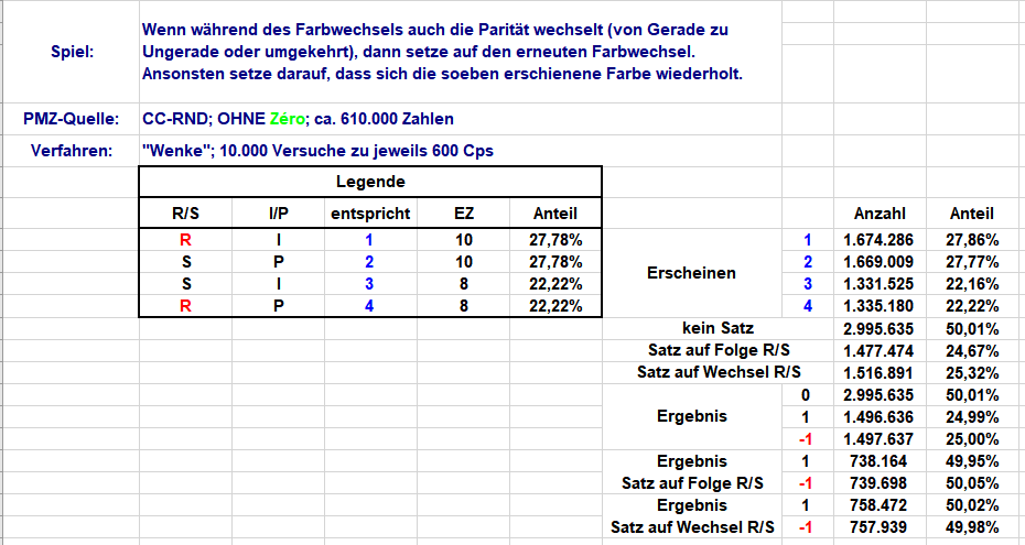Hallo @Hans Dampf (von), das Signal wird ja nur beim Farbwechsel überhaupt ausgelöst, mithin 50% kein Satz (kein Farbwechsel). Bei den anderen 50% fand ein Farbwechsel statt, davon je 25% mit Wechsel oder Folge der Parität. Wir können also diese Ungleichgewichte formulieren 25% Wechsel der Parität nach Farbwechsel zu 75% (Folge der Parität nach Farbwechsel 25% + kein Satz 50%) 25% Folge der Parität nach Farbwechsel zu 75% (Wechsel der Parität nach Farbwechsel 25% + kein Satz 50%) 25% Wechsel der Parität nach Farbwechsel zu 50% kein Satz 25% Folge der Parität nach Farbwechsel zu 50% kein Satz Eine nutzbare Asymmetrie ist mir dabei bis jetzt verschlossen geblieben. Bei dieser Betrachtung erscheint mir das Einbeziehen von Zéro nicht sinnvoll. Mit Erscheinen von Zéro wechselt ja zwangsweise sowohl Farbe als auch Parität - was dann die starre Satzanweisung produziert: nach Zéro immer Gegenfarbe setzen. Daß das nichts bringt, ist ja klar. Und bei Zwillingszéro und Triplezéro usf. muss man sich noch weitere Spezialanweisungen ausdenken (die auch nichts bringen). Gruss elementaar