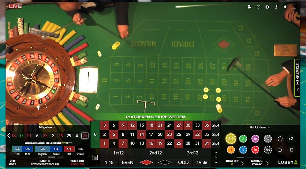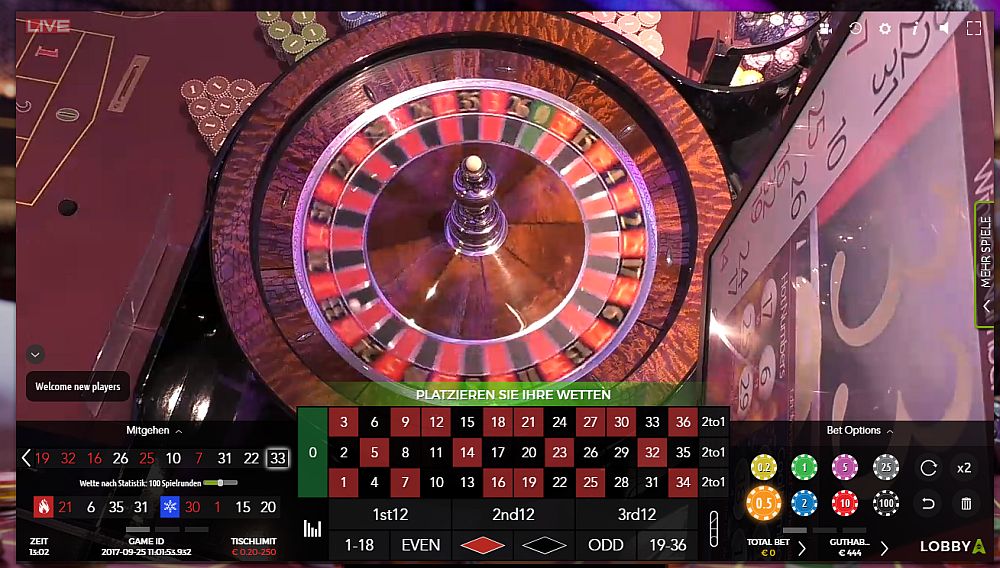 8. @alle 26-09-2017 18:54h In Kürze beginne ich die nächste Partie 2-016 im "Batumi" Live Casino. Die Plattform ist (z.B.: über Dublinbet, Mr.Green, etc.. zu erreichen) Beim Vorlauf verwende ich ein paar Coups der gelaufenen Partie Coups (Vorlauf) bisher: 31, 15, 25, 6, 15, 18, 6, 17, 13, 27, 7, 22, 11, 35, 9,... Update Vorauf Beendet Vorlauf HR I 31, 15, 25, 6, 15, 18, 6, 17, 13, 27, 7, 16, 12, 22, 11, 35, 9, 22, HR II 34, 1, 12, 13, 0, 14, 27, 8, 32, 6, 1, 20, 7, 18, 19, 26, 23, 32, 23 Partie Start: 1. Coup "35" Update 20:58h 1. Satz vor Coup 8 : "5" Update 21:04h 1. Treffer Coup 13 (F2aufF3) "5" (+29) - Wartephase... 1. Satz vor Coup 8 : "5" Update 21:16h 2. Angriff Start Coup 26 mit der "5" Update 21:24h 2. Treffer Coup32 "2" (+21) Partie Ende mit +50 Stk. Gruß: Roli888