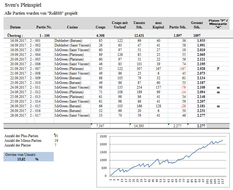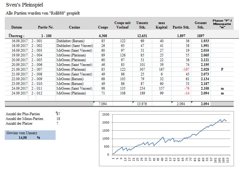 21. @Papa Maus Wenn 70% der Angriffe in die Hose gehen, da kann wirklich etwas nicht stimmen ??? Nach meinen 5 Jahre authentische Permanenzen Auswertung kommt der F3 von Coup 3 bis Coup 32 zu 94%. Allerdings wird der Angriff oft schon früher wegen dem verbrauchten Kapital abgebrochen. Hast Du schon die "Trockenübungen" mit Deiner Spielweise ausprobiert - dann müsstest Du auf ähnliche Ergebnisse wie ich kommen? M O N A T S - A U S W E R T U N G E N: BAD HOMBURG - Juli 2017 https://www.roulette-forum.de/topic/18025-testreihe-sven´s-spiel/?page=65&tab=comments#comment-367376 Weitere Monatsauswertungen: (Wiesbaden, Saarbrücken und Bad Homburg) https://www.roulette-forum.de/topic/18025-testreihe-sven´s-spiel/?page=111&tab=comments#comment-369670 ...Meinen Respekt für Deine viele und gründliche Arbeit hier im Forum!... Besten DANK! @ratzfatz Ich habe mir die Mühe gemacht und 5 Jahre authentische Permanenzen selber nach den Trefferpunkten überprüft. In meinen Auswertungen waren die Treffer etwas früher als nach der BIN die wir hier festgelegt haben und auch ausführlich ausdiskutiert wurde. Daher behalte ich festgelegten Werte nach der BIN. Infos dazu BIN Tabelle: https://www.roulette-forum.de/topic/18025-testreihe-sven´s-spiel/?page=51&tab=comments#comment-366689 ...Was mich bei roli stört ist, dass er in verschiedenen OCs spielt... Genaus das finde ich gut das ich derzeit mit den 0,50er EInsätzen mehrere Casinos an den unterschiedlichsten Orten per Mausklick verfügbar habe. Heute ist die Erste Partie mit -79 (Saint Vincent) ausgegangen. Die 2. Partie spielte ich dann im "Platinum" Casino. Die ersten 100 Partien habe ich bis auf einen Besuch im ACC Casino alle im "Batumi" gespielt. @data Ja mit den Screenshoots ist das so eine Sache. Ich versuche immer zu Beginn und zum Ende einen aktuellen Screenshoot anzufertigen. Manchmal vergesse ich aber auch darauf (Buchungen, Konzentration etc...). Falls möglich hole ich den Screenshot dann ein paar Coups später nach. Oder , so wie heute bei der 2. Partie - wenn ich den Beginn nicht "fotografiert" habe dann gibt's eben keinen. Gruß: Roli888