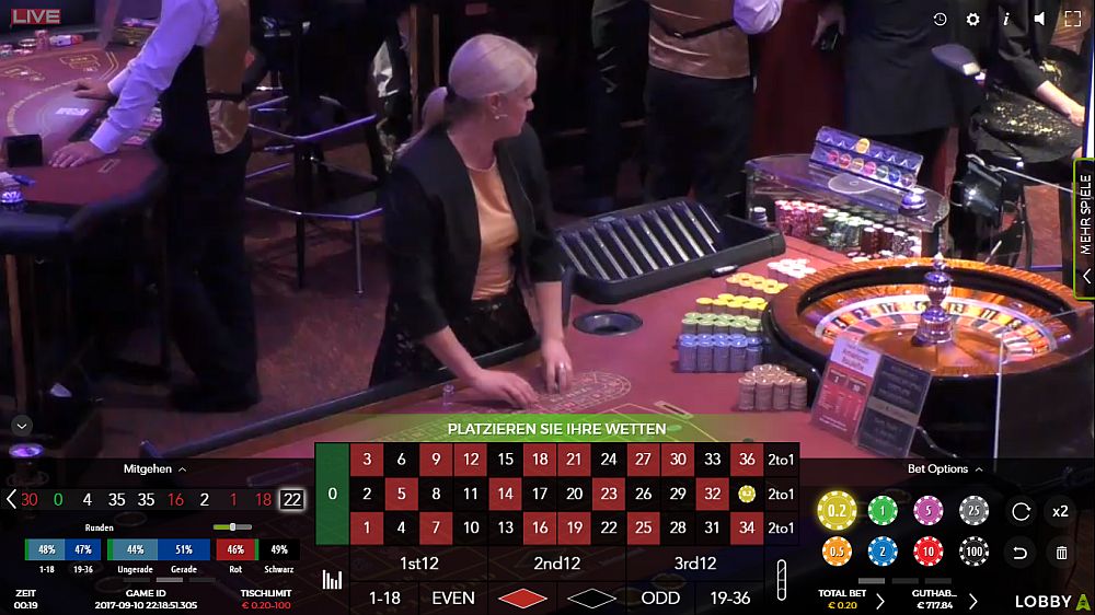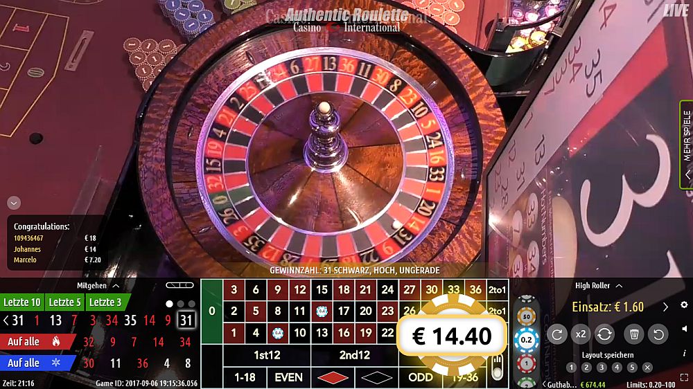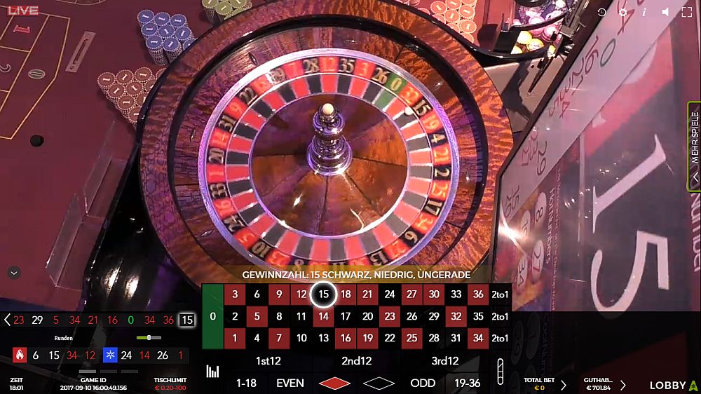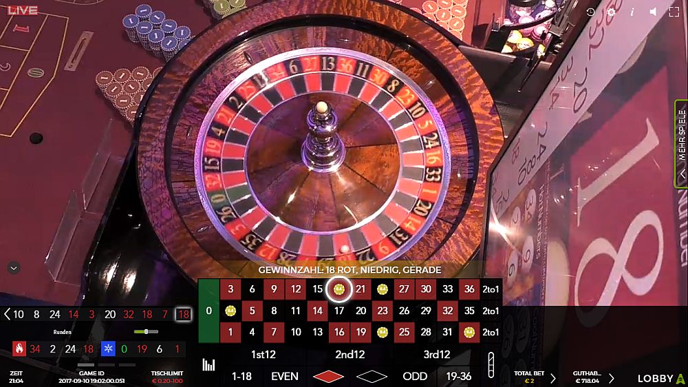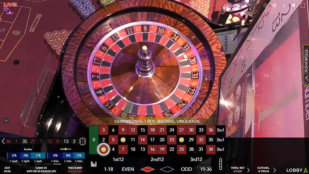 96. Auswertungs-Partie Statistik Partie Nr.: 90 Gespielt am 06.09.2017 im Dublinbet (Batumi) Live Casino Die Partie wurde nach 45 Coups mit +53 Stk. beendet. Klasse Partie - war sehr easy zu spielen... 2 fette Treffer - fertig! Coup Zahl 01. 32 02. 1 03. 7 04. 22 05. 5 06. 17 07. 10 08. 2 09. 13 10. 32 1. 2er - Satzstart 11. 29 12. 11 13. 31 14. 0 15. 32 TREFFER! Eingesetztes Angriff-Kapital: 5 Stk. Gezogen: +35 Stk. = Angriff-Gewinn: +30 Stk. Früher F3 - Wartephase… 16. 7 17. 26 18. 9 ---- Ende 1. HR ---- 19. 0 20. 20 es wird langsam wieder interessant in den neuen Angriff einzusteigen. "20" 1er - warten… 21. 36 1er - warten … 22. 14 1er - warten … 23. 26 "26" = F2 Favo - Start Neuer Angriff ----------------------- Satz: 1 Stk. auf "32" 24. 33 25. 10 26. 30 27. 31 28. 29 29. 6 30. 28 31. 14 32. 20 33. 23 34. 28 35. 12 36. 31 2. 3er 37. 1 ---- Ende 2. HR ---- 38. 13 39. 7 3. 3er 40. 3 41. 34 42. 35 43. 14 4. 3er (Satzerhöhung: 2 Stk. Je Plein) 44. 9 45. 31 TREFFER! Eingesetztes Angriff-Kapital: 47 Stk. Gezogen: +70 Stk. = Angriff-Gewinn: +23 Stk. PARTIE ENDE mit +53 Stk. 1. Angriff: +30 Stk. 2. Angriff: +23 Stk. ------------------------------ Gesamt: +53 Stk. Coups: 45 Umsatz: 52 Stk. Buchungsblatt: 96_Partie.pdf Screenshots: Partie Startpermanenz mit Satz zum Coup 11 Partie Ende mit finalem Treffer Statistik -