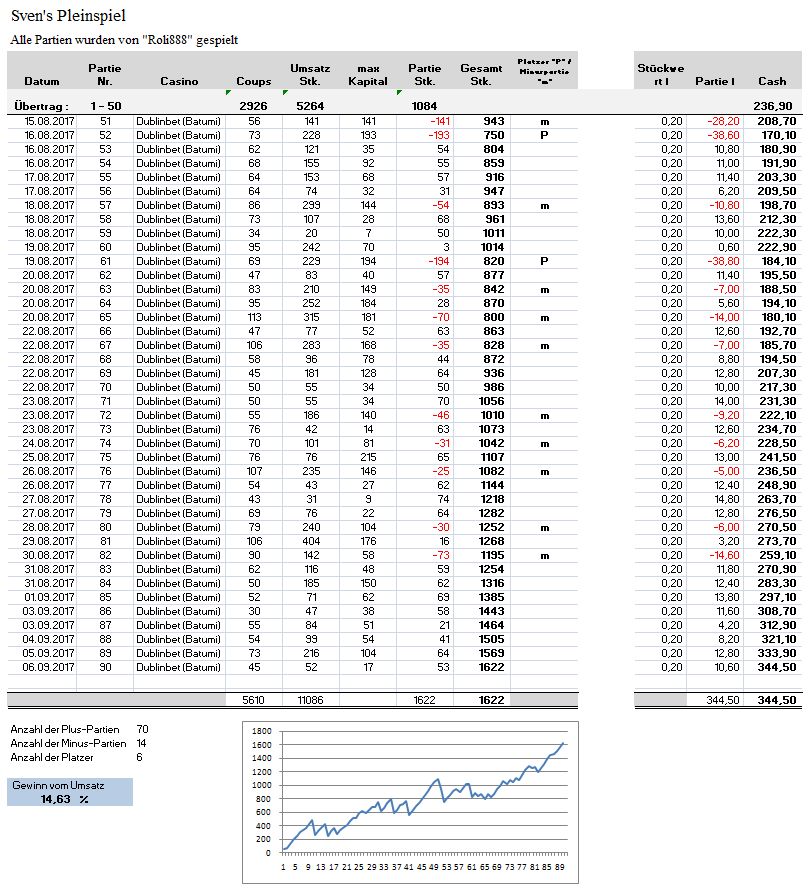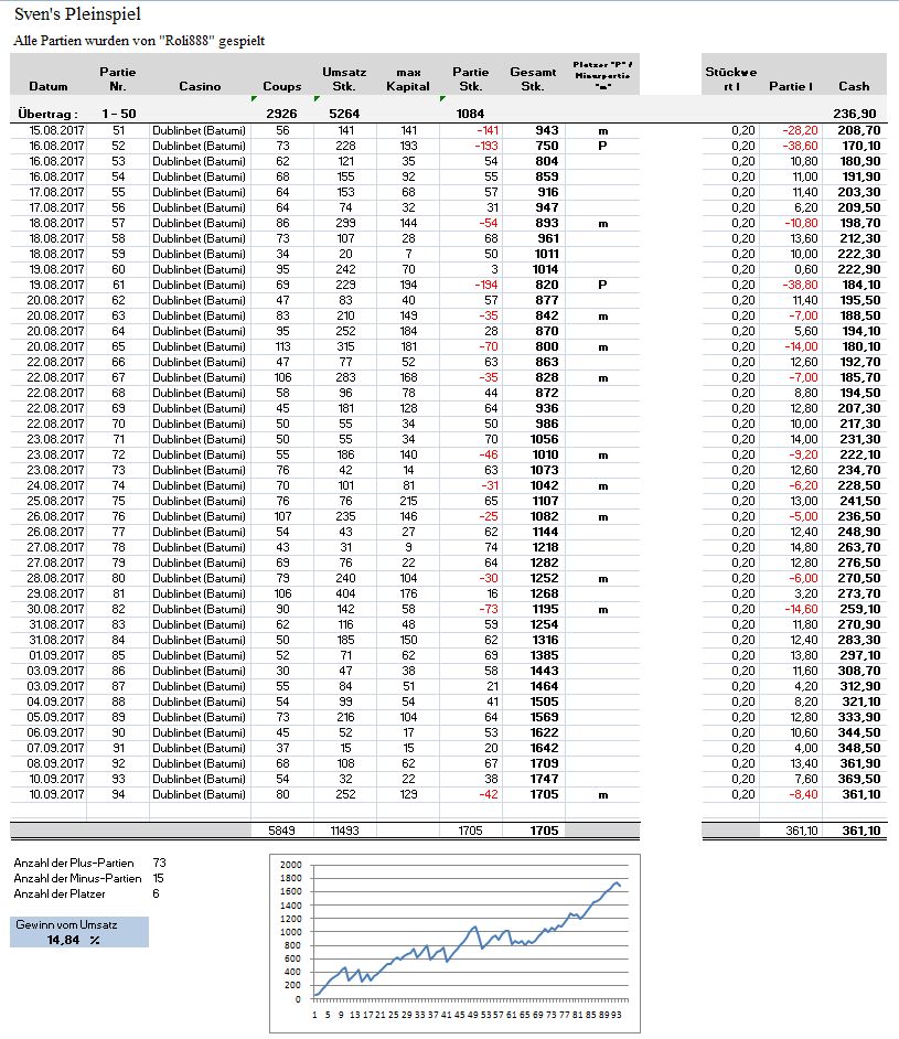 102. Auswertungs-Partie Statistik Partie Nr.: 96 Gespielt am 11.09.2017 im Dublinbet (Batumi) Live Casino Die Partie wurde nach 81 Coups mit +32 Stk. beendet. Coup Zahl 01. 30 02. 16 03. 26 04. 10 05. 34 06. 3 07. 32 08. 10 1. 2er - Satzstart 09. 11 10. 17 11. 22 12. 22 2. 2er 13. 14 14. 4 15. 26 3. 2er 16. 27 17. 30 4. 2er 18. 6 ---- Ende 1. HR ---- 19. 4 5. 2er 20. 21 21. 23 (Satzerhöhung: 2 Stk. Je Plein) 22. 17 6. 2er 23. 20 24. 13 (Satzerhöhung: 3 Stk. Je Plein) 25. 1 26. 34 7. 2er (Satzerhöhung: 4 Stk. Je Plein) 27. 26 TREFFER! Eingesetztes Angriff-Kapital: 132 Stk. Gezogen: +140 Stk. = Angriff-Gewinn: +8 Stk. Hinweis: Dieser Angriff wäre auch in der Grundfassung Satz: max. 5 Pleins und TVP Abgleich positiv abgeschlossen worden. Neuer Angriff ----------------------- Satz: 1 Stk. auf "26" 28. 3 29. 30 2. 3er 30. 25 31. 27 32. 14 33. 32 34. 8 35. 27 3. 3er 36. 22 4. 3er 37. 0 ---- Ende 2. HR ---- 38. 1 39. 20 40. 1 5. 3er (Satzerhöhung: 3 Stk. Je Plein) 41. 3 6. 3er TVP-Abgleich Die "30" wird nicht mehr gesetzt, da die zugehörige TVP die wenigsten Treffer (3x) hat. 42. 19 43. 26 TREFFER! Eingesetztes Angriff-Kapital: 63 Stk. Gezogen: +70 Stk. = Angriff-Gewinn: +7 Stk. Neuer Angriff ---------------------- Satz: 1 Stk. auf "26" 44. 31 45. 2 46. 34 47. 33 48. 2 49. 17 50. 17 2. 4er 51. 8 52. 23 53. 15 54. 16 55. 3 ---- Ende 3. HR ----3. 4er 56. 35 57. 23 58. 2 59. 32 (Satzerhöhung: 3 Stk. Je Plein) 60. 23 4. 4er 61. 18 62. 26 TREFFER! Eingesetztes Angriff-Kapital: 55 Stk. Gezogen: +70 Stk. = Angriff-Gewinn: +15 Stk. Neuer Angriff ------------------- Satz: 1 Stk. auf "26" 63. 31 64. 6 65. 8 66. 30 67. 13 68. 22 69. 0 70. 14 71. 2 72. 3 2. 5er 73. 25 74. 32 ---- Ende 4. HR ---- 75. 12 76. 20 77. 17 3. 5er 78. 15 79. 27 80. 30 4. 5er 81. 30 TREFFER! Eingesetztes Angriff-Kapital: 33 Stk. Gezogen: +35 Stk. = Angriff-Gewinn: +2 Stk. PARTIE ENDE mit +32 Stk. 1. Angriff: + 8 Stk. 2. Angriff: + 7 Stk. 3. Angriff: +15 Stk. 4. Angriff: + 2 Stk. ------------------------------ Gesamt: +32 Stk. Coups: 81 Umsatz: 283 Stk. Buchungsblatt: 102_Partie.pdf Screenshots: startpermanenz und Satz zum Coup 11 Partie Ende Statistik -