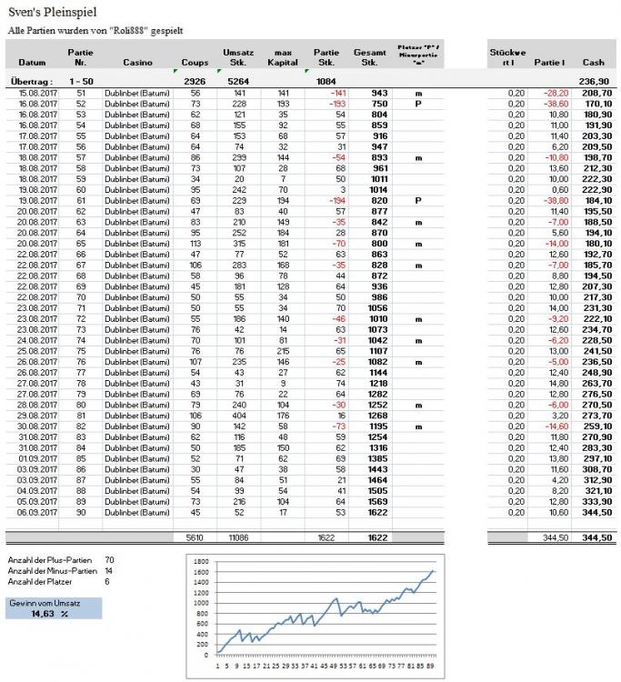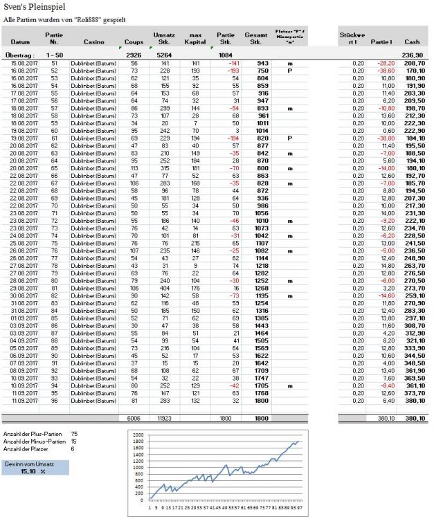 @data das kann ich Dir genau erklären, warum ich diesen Angriff bei -92 Stk. gestoppt habe: 1.) Habe ich bereits zu diesem Zeitpunkt 10 Partien mit Gewinn abgeschlossen, daher möchte ich bei einer etwaigen Negativ-Partie nicht zu viel verbrennen. 2.) Brachte der erste Angriff (nur) 3 Stk. Plus (ich bin nicht unzufrieden, jedes Plus ist toll, jedoch sind das für Entscheidungen bei weiteren Angriffen wichtige Fakten). Hätte der erste Angriff 20 - 30 Stk. gebracht, hätte ich bei dem Angriff noch 2x den 4 Stk. gemacht. 3.) In diesem Fall war meine Entscheidung, dass ich bei gutem Partie-Verlauf den Minussaldo noch gut aufholen kann. Falls die Permanenz diesmal nicht ganz so fein nach der BIN läuft, wäre ein Platzer so und so nicht zu vermeiden gewesen. Da aber die weiteren Angriffe gut gelaufen sind konnte ich das (leicht zu verschmerzende) Gesamt-Minus bereits in der nächsten Partie (Partie Nr.: 101 +63 Stk.) überflügeln. Das ist genau so ein Fall einer flexiblen Spielweise die man wahrscheinlich per Computer nur sehr abstrakt programmieren kann. Was aber Wichtig ist: Selbst wenn ich den Angriff auf -140 Stk. gespielt hätte wäre im Gesamtergebnis auch kein all zu großes Malheuer passiert. ...Warum hörst Du nicht bei Coup 41 auf ? ... Bei Coup 41 wäre ja die Punktlandung, egal falls möglich spiele ich generell immer 5 Coups oder mehr weiter. Sogar 10-15 Coups falls noch genug "Munition" vorhanden ist. Habe ich bisher bei ALLEN Angriffen wo es notwendig war so gemacht. Das wird auch so bleiben. Gruß: Roli888 -