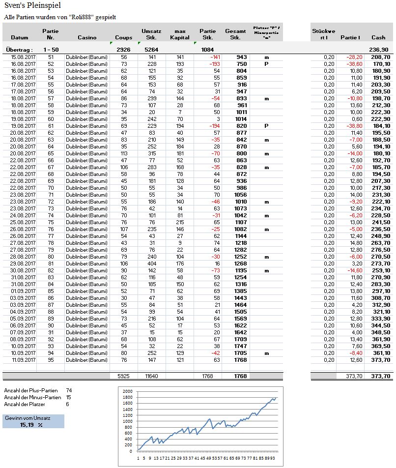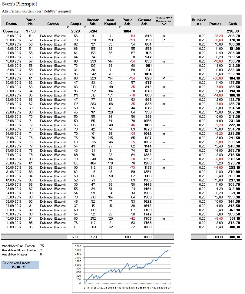 @sachse Ich war noch bei KEINEM (!) Pleinsystem so otimistisch wie bei Sven's Spielansatz. Bevor ich die Strategien mit Echtgeld spielte habe ich immer mehrere Monatspermanenzen ausgewertet Mit "Der amerikanische Ausgleich" und "Plein Royal" bin ich noch vorne. Alle anderen habe ich nach ca. 2-3 Monatsauswertungen wieder weggelegt. Beim "Amerikanischen Ausgleich - Telatzky Verlag" habe ich bisher eine Umsatzrendite von 9,3% im LiveCasino erzielt. Am Papier aber extreme Schwankungen die so +/- 2000 gehen. Viele Partien schließen nur mit einem kleinen Plussaldo ab. Das Tischkapital liegt bei ca. 300 Stk. Ein Sektorspiel auf "Zahl" 2-2 - also auch 5 Pleins. "Plein Royal" spielt nur auf eine Zahl und es sind sehr lange Wartezeiten einzuplanen. Teilweise ist man einige Tage hintereinander im Minus bis wieder eine Pluspartie folgt. Live bisher nur wenige Partien gespielt. Aufgrund der langen warterei mühsam. "Plein Royal" habe ich bisher 5 Monate Bad Homburg "Trockenübungen" ausgewertet und bin da auf einer Umsatzrendite von 10,99%. Der "Plein Dauergewinn - Grüttner" hat nach 4 Monate Auswertung eine Umsatzrendite von 5,5% mit Endstand 176 Stk. Sven's Pleinspiel dagegen unterscheidet sich von all diesen Strategien: Das es nach bisher quasi 6 Monate Auswertungen (4 Monate am Küchentisch und mittlerweile meine 2 Live Spiel Monate) bisher um Klassen besser abschneidet als alle anderen Pleinspiele die ich bisher ausgewertet habe. Es ist mir auch ganz klar das diese Strecke noch nicht's aussagt, jedoch sind die Schwankungen gut machbar. Ob es irgendwann total abdriftet werden wir ja sehen, glaube ich aber fast nicht. Wenn man den Spielansatz aktiv ausübt bekommt man ein gutes Gefühl wie's läuft bzw. laufen kann. Tischkapital nur 200 Stk. Einstieg in's Spiel nach moderater Wartezeit. Die Gewinne gegenüber Minuspartien sind gleichmäßiger und die Partie Plussalden stärker. Partiedauer mit ca. 2 -3 Rotationen sehr angenehm. (Plein Royal und Amerik Ausgleich können auch über 250 Coups gehen) Man kann einige Pleinspiel-Erfahrungen in den Spielansatz miteinbringen. etc... etc... Gruß: Roli -