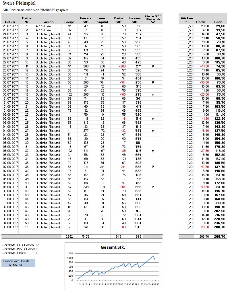 @Sven Besten Dank ! Es mach ja auch richtig Spaß und es ist hoch interessant wo die Reise hingeht... Dieser Spielansatz ist absolut toll, ich habe noch kein Pleinspiel mit so einer Effizienz gehabt. Daher gebührt der Dank eigentlich Dir. Es ist Dein (!) Spielansatz. Die Umsatzrendite ist bei meinen Partien zur Zeit noch zu hoch, daher bin ich auf alles eingestellt. H. Bühler schreibt im Buch bei seinem Spiel: "Geben wir uns jedoch keiner Illussion hin und erwarten nicht mehr als 3% Dauergewinn. Viel höhere Überschüsse werden wohl niemals von einem System erreicht werden, wenn auch des öfteren das Gegenteil behauptet wird." Nun ich lass das vorerst einmal so stehen wir werden ja sehen was alles eintrifft :-) Gruß: Roli888 -
