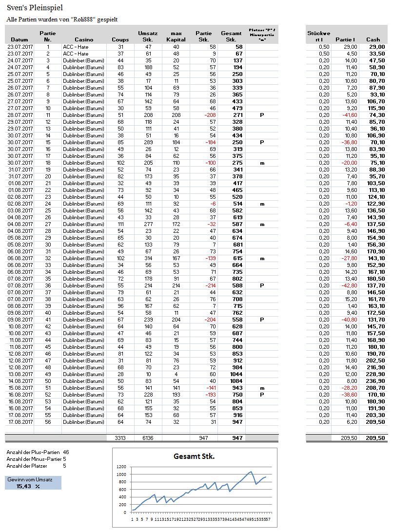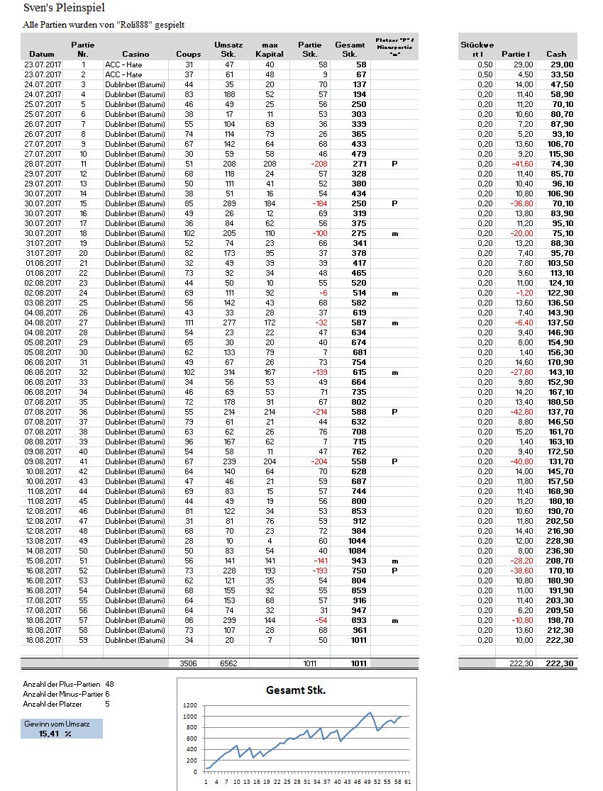 64. Auswertungs-Partie Statistik Partie Nr.: 58 Gespielt am 18.08.2017 im Dublinbet (Batumi) Live Casino Die Partie wurde nach 73 Coups mit + 68 Stk. beendet. Coup Zahl 01. 1 02. 24 03. 9 04. 24 1. 2er - Satzstart 05. 35 06. 3 07. 23 08. 29 09. 20 10. 36 11. 36 2. 2er 12. 32 13. 10 14. 21 15. 13 16. 0 3. 2er 17. 14 18. 34 ---- Ende 1. HR ---- 19. 28 20. 32 21. 36 TREFFER! Eingesetztes Angriffs-Kapital: 28 Stk. Gezogen: +35 Stk. = Angriff-Gewinn: +7 Stk. Etwas zu früher F3, kurze Wartephase... 22. 5 (1er - warten…) 23. 9 Favo (F2) Start Signal Neuer Angriff ---------------------- Satz: 1 Stk. "36" 24. 9 2. 3er 25. 28 26. 26 27. 23 28. 20 29. 30 30. 1 31. 35 32. 7 33. 17 34. 30 35. 36 TREFFER! Eingesetztes Angriffs-Kapital: 23 Stk. Gezogen: +35 Stk. = Angriff-Gewinn: +12 Stk. Früher F4, Wartephase... 36. 2 37. 26 ---- Ende 2. HR ---- 38. 23 39. 7 40. 26 41. 4 1er - warten … 42. 8 1er - warten … 43. 26 Guter Favo F4 - Start Neuer Angriff ---------------------- Satz je 1 Stk. "36" und "26" 44. 29 45. 17 46. 35 47. 30 48. 17 49. 21 50. 32 51. 1 52. 28 53. 25 54. 35 2. 4er "Pleinlücke" Sektorsatz - ich nehme die "3" dazu Sektor [3-1-1] 55. 1 ---- Ende 3. HR ---- 56. 34 (Satzerhöhung 2 Stk. je Plein) 57. 3 TREFFER! Eingesetztes Angriffs-Kapital: 41 Stk. Gezogen: +70 Stk. = Angriff-Gewinn: +29 Stk. Der Pleinlückensatz "3" hat getroffen! Wartephase auf den F5…. 58. 5 59. 19 60. 2 61. 18 62. 25 63. 1 Hier kommt der "echte" F5 Neuer Angriff ---------------------- Satz: 1 Stk. "1" 64. 10 65. 22 66. 27 67. 3 68. 26 2. 5er 69. 0 70. 28 71. 30 72. 32 73. 1 TREFFER! Eingesetztes Angriffs-Kapital: 15 Stk. Gezogen: +35 Stk. = Angriff-Gewinn: +20 Stk. PARTIE ENDE mit 68 Stk. 1. Angriff: + 7 Stk. 2. Angriff: +12 Stk. 3. Angriff: +29 Stk. 4. Angriff: +20 Stk. ------------------------------ Gesamt: + 68 Stk. Coups: 73 Umsatz: 107 Stk. Buchungsblatt: 64_Partie.pdf Screenshots: Bei Coup 11 Partie Ende - Treffer -