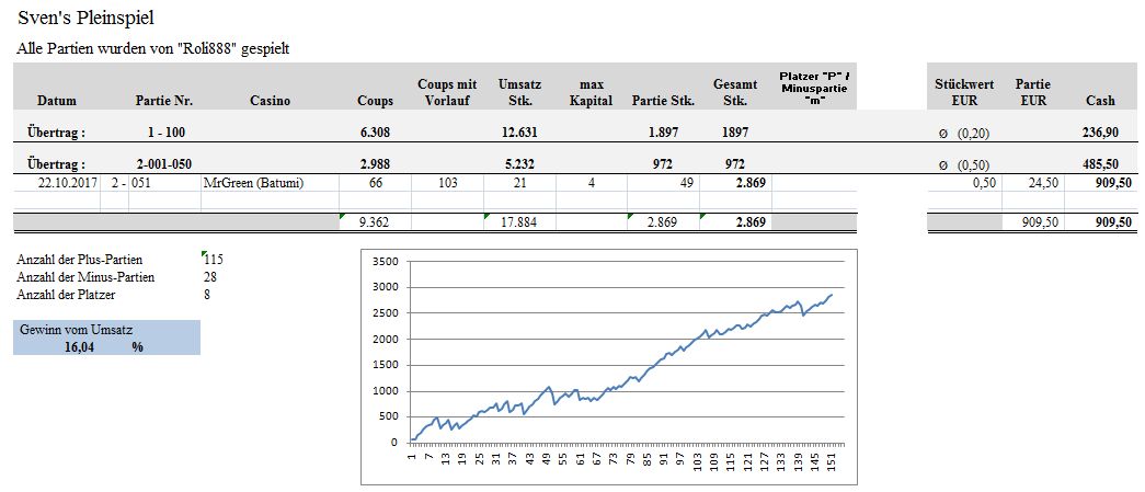 4. @FavRad Hallo, nein so eine Statistik habe ich noch nicht. Zu meinen Live-Spielen werte ich zusätzlich die einzelnen Angriffe nach Couplänge, Kapitalaufwand, Treffer bei Coup und zur Umsatzberechnung denSaldo aus. Allerdings sind die bisher gespielten Partien noch nicht aussagekräftig. Gruß: Roli888
