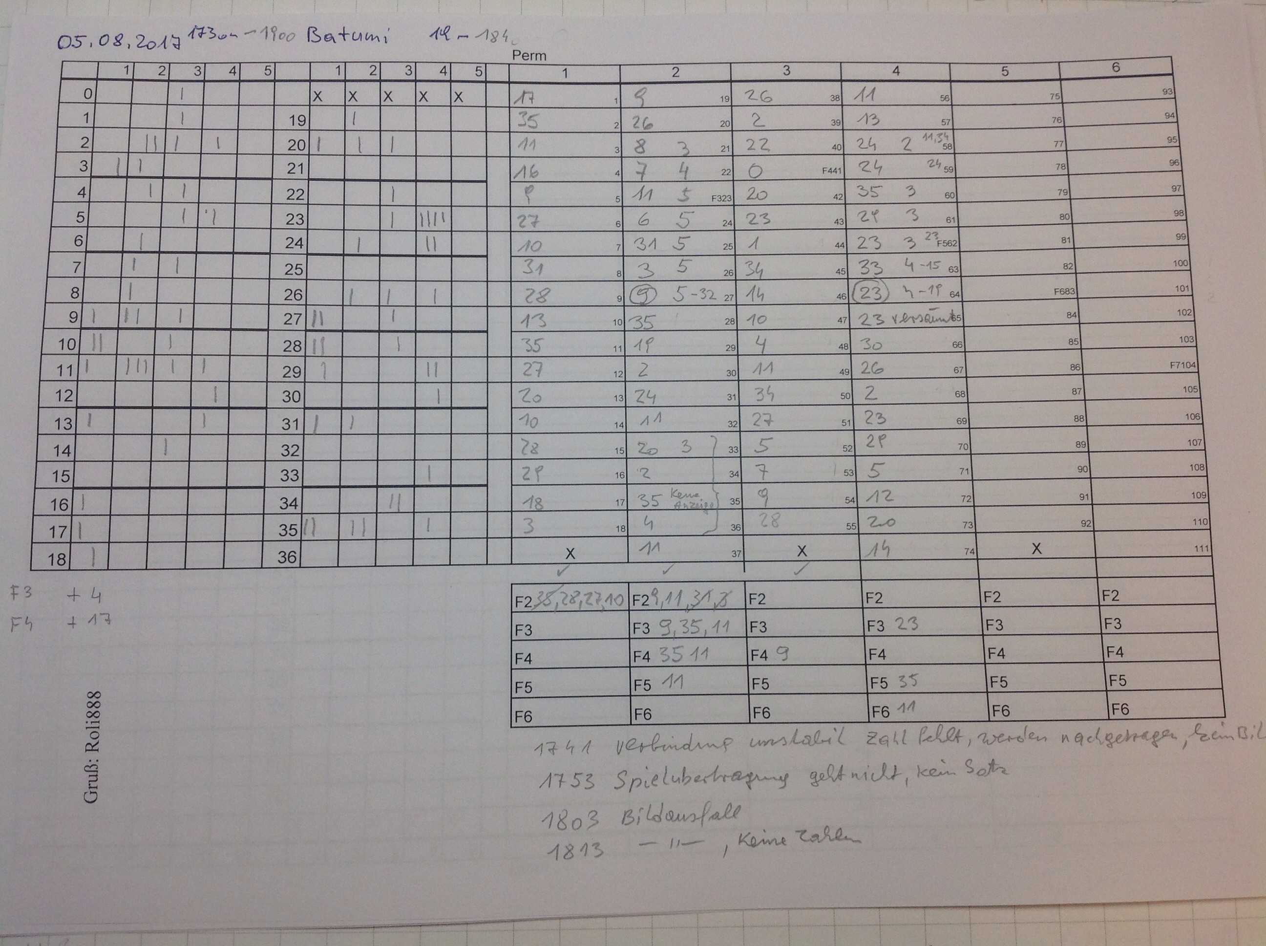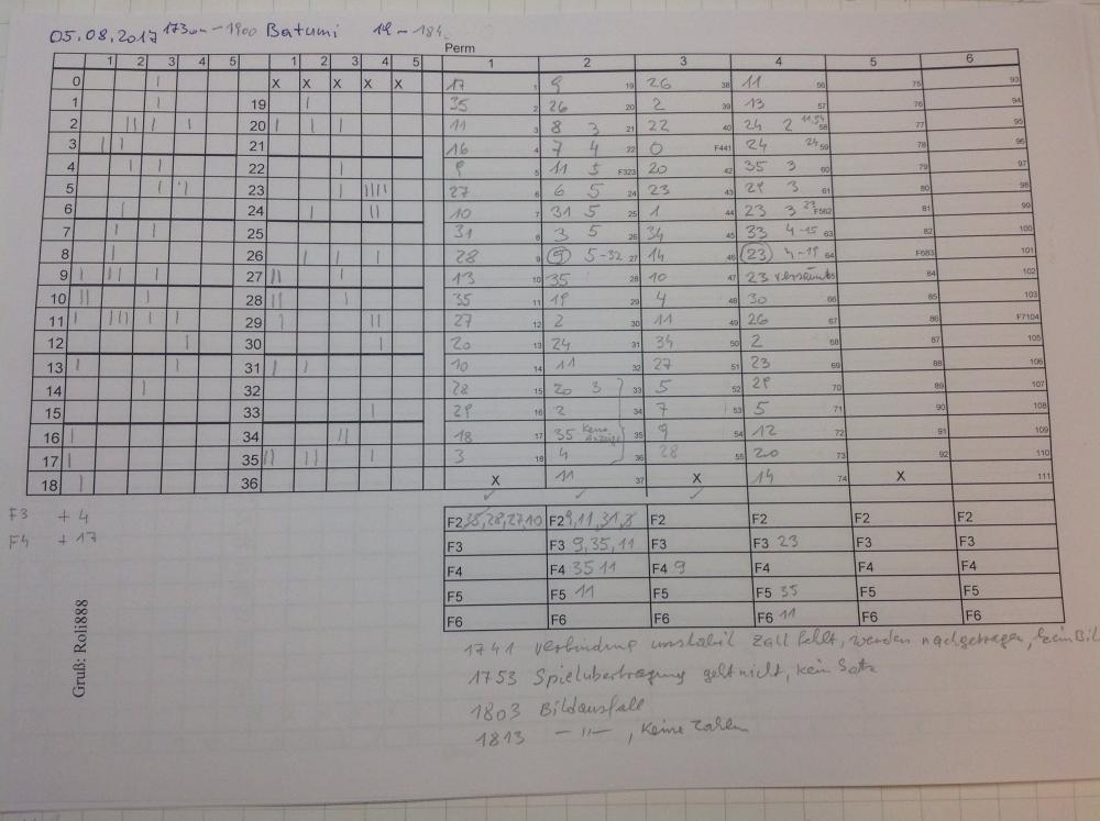 Hallo Roli! Du verwendest in Deinem Notitzblatt die schreibweise von Pojer, (ich kannte ihn aus Baden b. W.) bringt diese Art zu notieren, Dir einen Vorteil gegenüber der Strichliste? Die Strichliste ist mM schneller und übersichtlicher. Bei dem manchmal doch recht hohen Drehtempo am Batumi-Tisch. MfG hemjo -