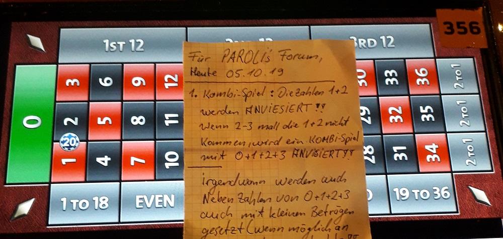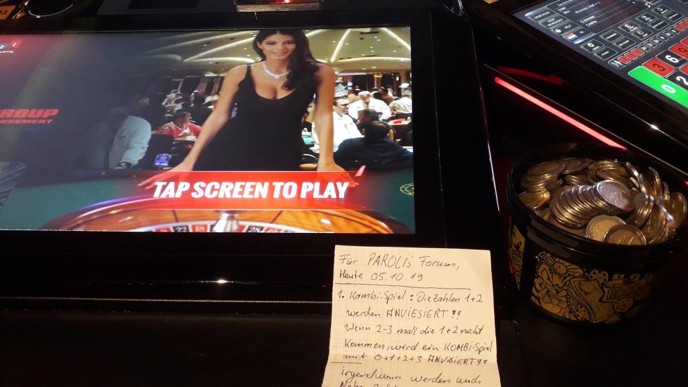 Hier jetzt die Videos vom 05.10.19 ( 2. Etage ) ! Spiele an einem Gerät 33 Zahlen ( " Futter Gerät ) ! Die Zahlen 20-21-23-24 bleiben frei ! Die Zahlen 20-21-23-24 werden an anderen Geräten hoch gesetzt !! Neben zahlen immer wieder mit kleinen Einsätzen an einem weiteren Gerät spielen ! Nachdem ich mit der 23 gewann , mache ich keine pause ( ein Fehler ) ! ich setze an einem anderen Gerät 4 Euro als Carré auf Die Hauptzahlen ,,.. es kommt Die 24 ! Warum ich das erwähne ?? damit Ihr das Wahrnehmt , das mit , BEREUEN LASSEN , HOFFNUNG MACHEN usw. ! Nach 24 kommt Die 20 ( Die Zahlen kommen auch nur weil ich die NICHT WIEDER HOCH SPIELE , um mich BEREUEN zu lassen ) ! Danach kommt die 10 , Neben Zahl von Hauptzahlen ! ich fange an , wieder das Kombi-spiel zu spielen und setze die Hauptzahlen ( 20-21-23-24 ) Hoch ,... die 2 Kommt , Nebenzahl von 21 ( HOFFNUNG MACHEN ) ! Danach kommt die 14 , Nebenzahl von 20 ! Nach einem weiteren spiel kommt die 5 Nebenzahl von 24 ! Wie man sehen kann muss ich einen Gerät frei machen , setze mein letzten 2 Euro auf dem Gerät auf 23 und , gebe danach das Gerät frei für andere Spieler ,.. Der spielt natürlich nicht mehr die 23 ^^ ! Dann kommt meine Hauptzahl 23 :-) ,,( 244,80 Euro Gewinn ) . Ihr müsst Euch , mit all Eurem Wissen , über Magnet und Computer " Intelligenz " anstrengen und alles einsetzen um Den Computer auszutricksen ! Was kommt nachdem ich nicht mehr setze ?? Die 20 ,,..hahaha ,,.. ( ich weiß ja das es kommt um mich zum spiel zu locken ^^, deshalb ärgere ich mich nicht , weil ich weiß , das es nicht gekommen wäre , wenn ich wieder Die Hauptzahlen gesetzt hätte ) ! Das 1. video ( 2. Etage ) . https://www.youtube.com/watch?v=TjlWp9ZUD0o&t=6s *************************************************************************************************************************************************** Nach der Pause , Verliere ich an Dem gerät fasst die ganzen 500 Euro ,... Gewinne aber an einem anderen Gerät viel mehr ,,, weil Akku vom Handy schwach wurde habe ich nicht mehr Aufgenommen ! 2. Video vom 05. 10. 19. ,,Geld abdrucken ,( 2 Etage ) https://www.youtube.com/watch?v=EH8AgwFIgSs ************************************************************************************************************************************************* 3. Video vom 05. 10. 19. Auszahlung vom Gerät auf der 2 Etage https://www.youtube.com/watch?v=DPB3fKNKS5g Der Reingewinn am 05.10.19 waren ca 1800-2000 Euro
