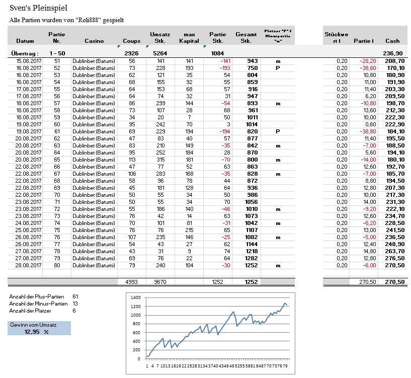Roli888 Geschrieben August 28, 2017 Geschrieben August 28, 2017 86. Auswertungs-Partie Statistik Partie Nr.: 80 Gespielt am 28.08.2017 im Dublinbet (Batumi) Live Casino Die Partie wurde nach 79 Coups mit -30 Stk. beendet. Coup Zahl 01. 17 02. 25 03. 32 04. 24 05. 8 06. 19 07. 1 08. 32 1. 2er - Satzstart 09. 23 10. 14 11. 27 12. 30 13. 27 2. 2er 14. 6 15. 24 3. 2er 16. 35 17. 6 4. 2er 18. 16 ---- Ende 1. HR ---- 19. 19 5. 2er mit der "19" wäre auch die Pleinlücke "15" zu setzen, da ich aber bereits 5 Favo Pleins im Spiel habe, setze ich die "15" nicht. 20. 25 6. 2er 21. 35 7. 2er (Satzerhöhung: 2 Stk. Je Plein) 22. 15 (hier die "15" "Pleinlücke" die ich nicht gesetzt habe.) 23. 2 (Satzerhöhung: 3 Stk. Je Plein) 24. 12 25. 25 TREFFER! Eingesetztes Angriffs-Kapital: 104 Stk. Gezogen: +105 Stk. = Angriff-Gewinn: +1 Stk. Neuer Angriff ----------------------- Satz: 1 Stk. auf "25" 26. 2 27. 18 28. 5 29. 30 30. 8 31. 11 32. 31 33. 32 2. 3er 34. 24 3. 3er 35. 30 4. 3er 36. 1 37. 13 ---- Ende 2. HR ---- 38. 31 39. 9 40. 23 (Satzerhöhung: 2 Stk. Je Plein) 41. 24 TREFFER! Eingesetztes Angriffs-Kapital: 41 Stk. Gezogen: +70 Stk. = Angriff-Gewinn: +29 Stk. Neuer Angriff ---------------------- Satz: 1 Stk. auf "24" 42. 10 43. 31 44. 26 45. 34 46. 16 47. 16 48. 16 2. 4er 3x In Folge der Nachbar Motto: cool bleiben... 49. 11 50. 36 51. 30 3. 4er 52. 20 53. 12 54. 18 55. 5 ---- Ende 3. HR ---- 56. 15 57. 28 58. 36 (Satzerhöhung: 2 Stk. Je Plein) 59. 26 60. 22 3. 4er 61. 17 62. 15 63. 11 (Satzerhöhung: 3 Stk. Je Plein) 64. 28 65. 23 Angriff Ende -82 Stk. 66. 1 67. 18 68. 23 69. 27 70. 20 71. 30 erster F5 Neuer Angriff ------------------------ Satz: 1 Stk. "30" 72. 13 73. 2 74. 28 ---- Ende 4. HR ---- 75. 7 76. 18 2. 5er 77. 16 3. 5er 78. 21 79. 30 TREFFER! Eingesetztes Angriff-Kapital: 13 Stk. Gezogen: +35 Stk. = Angriff-Gewinn: +22 Stk. PARTIE ENDE mit -30 Stk. 1. Angriff: + 1 Stk. 2. Angriff: +29 Stk. 3. Angriff: - 82 Stk. 4. Angriff: +22 Stk. ------------------------------ Gesamt: - 30 Stk. Coups: 79 Umsatz: 240 Stk. Buchungsblatt: 86_Partie.pdf Screenshots: Coup 48 - Dreierschlag "16" Partie Ende Statistik