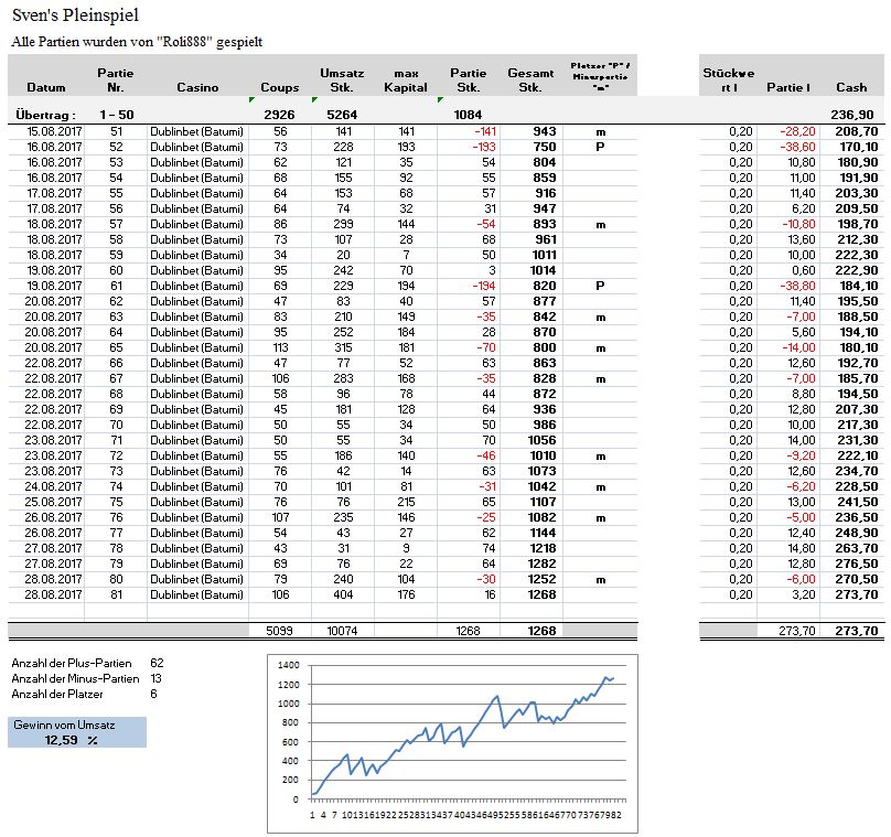 Roli888 Geschrieben August 29, 2017 Geschrieben August 29, 2017 (bearbeitet) 87. Auswertungs-Partie Statistik Partie Nr.: 81 Gespielt am 29.08.2017 im Dublinbet (Batumi) Live Casino Die Partie wurde nach 106 Coups mit +16 Stk. beendet. Coup Zahl 01. 7 02. 34 03. 36 04. 8 05. 3 06. 5 07. 10 08. 8 1. 2er - Satzstart 09. 13 10. 14 11. 9 12. 27 13. 16 14. 4 15. 25 16. 31 17. 3 2. 2er 18. 1 ---- Ende 1. HR ---- 19. 30 20. 2 21. 13 3. 2er 22. 31 4. 2er 23. 14 5. 2er 24. 19 25. 27 6. 2er 26. 35 27. 2 7. 2er 28. 2 TREFFER! Eingesetztes Angriff-Kapital: 79 Stk. Gezogen: +105 Stk. = Angriff-Gewinn: +26 Stk. Anmerkung: Dieser Angriff hätte auch in der Ursprungsvariante, mit TVP Abgleichen und maximal nur 5 Pleins zu setzen, gewonnen (!) Neuer Angriff ----------------------- Satz: 1 Stk. auf "2" 29. 32 30. 9 31. 35 32. 33 33. 20 34. 30 35. 32 36. 8 2. 3er 37. 30 ---- Ende 2. HR ---- 38. 3 3. 3er 39. 35 4. 3er 40. 23 41. 23 42. 14 43. 1 44. 6 45. 17 46. 26 47. 33 Angriff Ende mit -92 Stk. Ich befinde mich 6 Coups über der Treffer-Erwartung nach der BIN. Mehr möchte ich für den Angriff nicht mehr riskieren, da ich durch die +26 vom ersten Angriff noch gute Chancen habe, das Partie-Minus klein zu halten. Statt den Angriff weiter zu progressieren entscheide ich mich für einen Coupfenster Cut (ich blende die 1. HR visuell aus) und greife die aktuellen F3 auf F4 an. Neuer Angriff ---------------------- Satz: je 1 Stk. auf "2", "30" und "35" 48. 17 49. 35 TREFFER! Eingesetztes Angriff-Kapital: 6 Stk. Gezogen: +35 Stk. = Angriff-Gewinn: +29 Stk. OK im Nachhinein ist man immer gescheiter, hätte ich (da sind wir wieder bei einem meiner Lieblingswörter im Roulette "hätte") den Angriff vorher noch 2 Coups weiter gespielt wäre auch der vorige Angriff mit positiven Saldo abgeschlossen. Ich spiele weiter ... Nun gehe ich wieder zum Grundspiel retour und greife die F4 auf F5 an Neuer Angriff ----------------------- Satz: 1 Stk. auf "35" 50. 7 51. 4 52. 30 2. 4er 53. 0 54. 33 55. 24 ---- Ende 3. HR ---- 56. 29 57. 32 58. 9 59. 5 60. 36 61. 23 62. 20 63. 31 64. 28 65. 23 3. 4er "Pleinlücken Satz" mit der "23" entstand eine Pleinlücke zwischen ""30" und "23" daher setze ich die "8" als Sektorsatz [8-1-1] mit 66. 22 67. 0 68. 29 69. 26 70. 5 71. 19 72. 7 "Erweiterter Angriff" Da im 2. Angriff F3 auf F4 der Treffer 2 Coups später kam, hoffe ich dass es in diesem Fall auch gut geht und entschließe mich für einen erweiterten Angriff der bis zu -140 Stk. geht. 73. 28 74. 25 ---- Ende 4. HR ---- 75. 8 3. 4er TREFFER! Der Pleinlückensatz hat getroffen. Eingesetztes Angriffs-Kapital: 133 Stk. Gezogen: +140 Stk. = Angriff-Gewinn: +7 Stk. Aber der F5 ist noch nicht erschienen! Nun habe ich frische "Jeton Munition" und denke mir das der F5 bald kommen sollte. daher greife ich weiter den F4 auf F5 an. Neuer Angriff ------------------- Satz: je 1 Stk. (also die F4er) auf "8", "35", "30" und "23" 76. 18 77. 6 78. 14 79. 25 80. 13 81. 19 82. 29 83. 9 84. 8 Da ist er der 1. F5 (!) TREFFER! Eingesetztes Angriff-Kapital: 40 Stk. Gezogen: +70 Stk. = Angriff-Gewinn: +30 Stk. Neuer Angriff ----------------------- Satz: 1 Stk. auf "8" 85. 15 86. 13 87. 3 88. 21 89. 36 90. 21 91. 5 92. 26 ---- Ende 5. HR ---- 93. 5 2. 5er 94. 17 95. 16 96. 26 97. 36 98. 3 3. 5er 99. 11 100. 29 101. 4 102. 31 103. 4 104. 17 105. 30 106. 3 TREFFER! Eingesetztes Angriff-Kapital: 54 Stk. Gezogen: +70 Stk. = Angriff-Gewinn: +30 Stk. PARTIE ENDE mit +16 Stk. 1. Angriff: +26 Stk. 2. Angriff: - 92 Stk. 3. Angriff: +29 Stk. 4. Angriff: + 7 Stk. 5. Angriff: +30 Stk. 6. Angriff: +16 Stk. ------------------------------ Gesamt: +16 Stk. Coups: 106 Umsatz: 404 Stk. Buchungsblatt: 87_Partie.pdf Screenshot: Startpermanenz Statistik bearbeitet August 29, 2017 von Roli888
