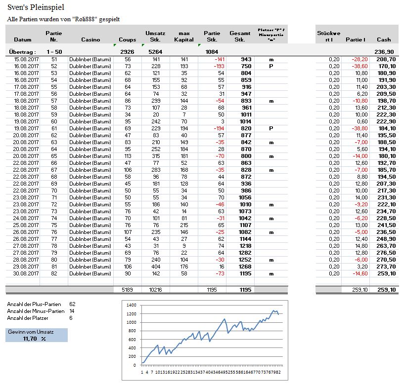 Roli888 Geschrieben August 31, 2017 Geschrieben August 31, 2017 (bearbeitet) 88. Auswertungs-Partie Statistik Partie Nr.: 82 Gespielt am 30.08.2017 im Dublinbet (Batumi) Live Casino Die Partie wurde nach 90 Coups mit -73 Stk. beendet. Coup Zahl 01. 14 02. 31 03. 27 04. 22 05. 32 06. 6 07. 1 08. 33 09. 7 10. 25 11. 8 12. 32 1. 2er - Satzstart 13. 19 14. 17 15. 19 2. 2er "Pleinlücke" "15" wird mitgesetzt. Sektor [15-1-1] 16. 12 17. 10 18. 7 ---- Ende 1. HR ----3. 2er 19. 20 20. 9 21. 15 TREFFER! Pleinlücken Satz "15" hat getroffen. Eingesetztes Angriffs-Kapital: 24 Stk. Gezogen: +35 Stk. = Angriff-Gewinn: +11 Stk. Ich warte (mit bisher 11 Stk. Plus) bis der erste F3 erscheint.... 22. 23 23. 8 24. 14 25. 13 26. 24 27. 3 28. 33 29. 8 Erster F3 Hinweis: hätte ich beim Treffer mit der "15" (Pleinlücke) auf den F3 weiter gespielt, wäre der Angriff auch positiv mit einem Gewinn von +20 Stk. beendet. Ich wollte jedoch mit 11 Stk. Plus des ersten Treffers nicht zu viel riskieren und entschloss mich den F3 abzuwarten. Neuer Angriff ----------------------- Satz: 1 Stk. auf "8" 30. 12 31. 12 2. 3er 32. 17 33. 3 34. 26 35. 16 36. 36 37. 26 ---- Ende 2. HR ---- 38. 28 39. 8 TREFFER! Eingesetztes Angriffs-Kapital: 18 Stk. Gezogen: +35 Stk. = Angriff-Gewinn: 7 Stk. 40. 8 erster F5 sehr früh … - Wartephase Treffer versäumt da ich noch 2 Coups warten wollte. 41. 5 42. 16 43. 19 44. 29 45. 0 46. 24 47. 26 48. 15 49. 7 50. 33 51. 7 52. 30 53. 20 54. 14 55. 32 ---- Ende 3. HR ---- 56. 20 57. 3 58. 15 59. 28 60. 13 61. 4 62. 18 1er - warten ... 63. 35 1er - warten ... 64. 7 2. 5er - Starker Favo - Start Neuer Angriff --------------------------- Je 1 Stk. "8" und "7" 65. 30 66. 10 67. 35 68. 2 69. 16 70. 32 71. 30 72. 18 73. 17 74. 0 ---- Ende 4. HR ---- 75. 25 76. 12 77. 10 78. 21 79. 10 80. 25 81. 6 82. 13 83. 10 3. 5er 84. 25 85. 6 86. 0 87. 27 88. 5 89. 6 Angriff Ende -100 Stk. Mit 4 Pleins 7 Coups über der Treffer-Erwartung nach der BIN. Ich beende hier den Angriff mit -100 Stk. PARTIE ENDE mit -73 Stk. 1. Angriff: + 11 Stk. 2. Angriff: + 17 Stk. 3. Angriff: -100 Stk. ------------------------------ Gesamt: - 73 Stk. Coups: 90 Umsatz: 142 Stk. Buchungsblatt: 88_Partie.pdf Screenshots: Start Permanenz 1 Coup nach Partie-Ende Statistik bearbeitet August 31, 2017 von Roli888