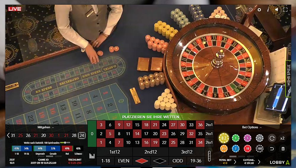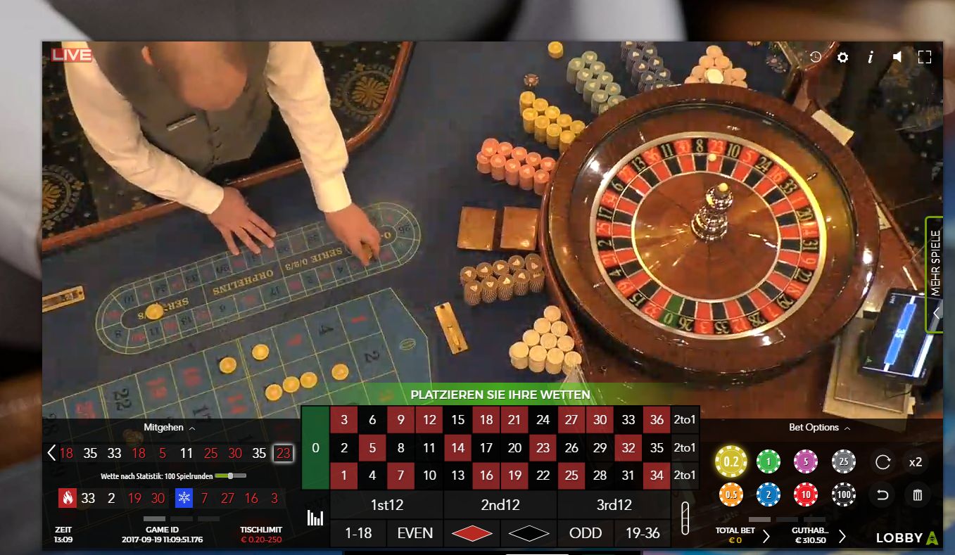 Roli888 Geschrieben September 19, 2017 Geschrieben September 19, 2017 (bearbeitet) 2-004 Live-Partie Gespielt am 19.09.2017 bei Mr.Green im PLATINUM (Rumänien/Bukarest) Live Casino Die Partie wurde nach 89 (mir Vorlauf 126) Coups mit +55 Stk. beendet. 1 Stk. = 0,50 EUR Vorlauf HR I 9, 30, 30, 29, 8, 13, 24, 30, 4, 19, 0, 30, 19, 28, 29, 18, 33, 21, HR II 34, 19, 1, 19, 4, 28, 29, 33, 10, 18, 35, 33, 18, 5, 11, 25, 30, 35, 23 Der Vorlauf brachte in jeder HR sehr zeitige F3 und Gesamt bereits 2x F4 und 1x F5 Coup Zahl 01. 6 02. 6 1. 2er - Ein Doppelschlag zu Beginn gehört nicht zu meinen Lieblings Angriff Start, daher warte ich ein wenig bis sich zumindest ein Favo zeigt der auch in der Vorbuchung gekommen ist. 03. 17 Im Vorlauf nicht gekommen, 1er - warten 04. 33 Schöner Favo - in allen HRs (incl. Vorbuchung enthalten) - Startsignal Neuer Angriff ----------------------- Satz: 1 Stk. auf "6" 05. 8 06. 8 2. 2er 07. 0 08. 8 TREFFER! Eingesetztes Angriff-Kapital: 6 Stk. Gezogen: +35 Stk. = Angriff-Gewinn: +29 Stk. Früher F3 - Wartephase (wie auch in der Vorbuchung zeigte sich beim ersten Angriff ein früher F3) 09. 23 10. 29 11. 12 12. 31 13. 16 14. 24 15. 24 16. 25 17. 34 18. 12 ---- Ende 1. HR ---- 19. 24 2. F3 daher Satzstart mit mindestens 2 Pleins. In der Wartephase gebe ich noch 3 Coups dazu. Frühester Start ab Coup 25 20. 34 21. 0 22. 27 23. 26 24. 18 1er - warten 25. 12 3. F3 daher Satzstart mit mindestens 3 Pleins. In der Wartephase gebe ich noch WarteCoups dazu. Frühester Start ab Coup 28 26. 34 27. 1 4. F3 daher Satzstart mit mindestens 4 Pleins. In der Wartephase gebe ich noch WarteCoups dazu. Frühester Start ab Coup 31 28. 18 29. 23 30. 0 5. F3 daher Satzstart mit mindestens 5 Pleins. In der Wartephase gebe ich noch WarteCoups dazu. Frühester Start ab Coup 34 31. 28 32. 6 F3 bereits der 6. F3 (!) in der Wartephase. TVP Abgleich. Die "6" kommt dann beim Angriff nicht in's Spiel, da sie die wenigsten Treffer in der zugehörigen TVP hat und auch im Vorlauf nicht erschienen ist. (Beim nächstenmal werde ich in so einer Situation - also wenn schon 6 Pleins zum nächsten Angriff während der Wartephase spielreif werden - den (fiktiven) Treffer abwarten und dann die neue aktuelle Favostufe angreifen.) 33. 35 In der vorigen HR nicht erschienen - warten … 34. 16 F2 Favo - Startsignal zum Angriff Neuer Angriff ------------------------ Satz: Je 1 Stk. "8", "24", "12", "34", und "0" 35. 13 36. 27 37. 6 Angriff Ende mit -15 Stk. Es wurde genau die "6" die ich nach dem TVP-Abgleich nicht gesetzt habe zum F4 Früher F4 - kurze Wartephase. Nächster Angriff Start frühestens ab Coup 41 ---- Ende 2. HR ---- 38. 1 39. 29 40. 33 In der vorigen HR nicht erschienen, warten … 41. 26 F2 Favo - Signal zum Angriff Neuer Angriff ---------------------- Satz: 1 Stk. auf "6" 42. 10 43. 30 44. 31 45. 12 2. 4er 46. 4 47. 14 48. 22 49. 7 50. 11 51. 9 52. 24 3. 4er 53. 19 54. 14 55. 10 ---- Ende 3. HR ---- 56. 33 57. 32 (Satzerhöhung: 2 Stk. je Plein) 58. 24 TREFFER! Eingesetztes Angriff-Kapital: 39 Stk. Gezogen: +70 Stk. = Angriff-Gewinn: +29 Stk. Wartephase (der F6 wird nach der Bin bei Coup 83 erwartet, da ich meine Angriffe frühestens 20 Coups davor starte, ist der frühest mögliche Angriffstart ab Coup 64 59. 3 60. 21 61. 14 62. 13 63. 25 Ist in den beiden vorigen HRs nicht gekommen, warten… 64. 30 Schöner Favo - Startsignal Neuer Angriff ------------------- Satz: 1 Stk. auf "24" 65. 5 66. 13 67. 18 68. 29 69. 0 70. 30 71. 19 72. 25 73. 34 74. 16 ---- Ende 4. HR ---- 75. 32 76. 22 77. 2 78. 22 79. 8 80. 31 81. 25 82. 26 83. 21 84. 20 85. 30 86. 1 87. 21 88. 28 89. 24 TREFFER! Eingesetztes Angriff-Kapital: 25 Stk. Gezogen: +35 Stk. = Angriff-Gewinn: +10 Stk. PARTIE ENDE mit +55 Stk. 1. Angriff: +29 Stk. 2. Angriff: -15 Stk. 3. Angriff: +31 Stk. 4. Angriff: +10 Stk. ------------------------------ Gesamt: +55 Stk. Coups: 89 (mit Vorlauf: 126) Umsatz: 85 Stk. Hinweis: Der Cash Saldostand bei den Bildern ist nach Partie Ende höher, da ich während des Angriffes vom F4 auf den F5 aufgefordert wurde mein Weiterspiel (Zeitlimit) zu bestätigen. Dabei ist der einzusetzende Jetonwert wieder auf 0,20 EUR gesprungen, ich hab das vorab nicht bemerkt erst als ich 2 Stk. je Plein beim Coup 58 setzte, bemerkte ich das da was nicht stimmt. Das hat natürlich einiges an Kapital gespart. Buchungsblatt: 2-004_Partie.pdf Screenshots: Ende des Vorlaufes Partie Ende Statistik bearbeitet September 19, 2017 von Roli888