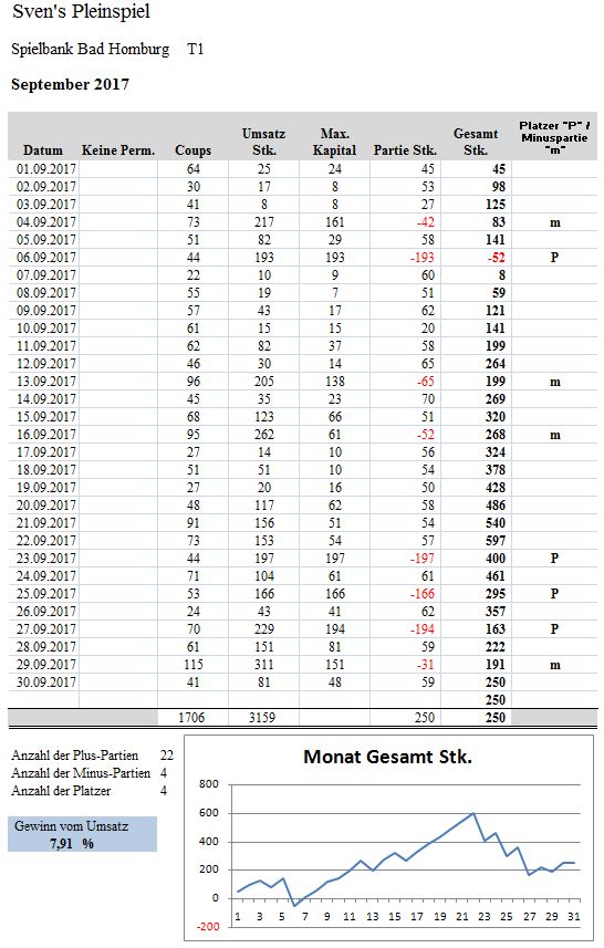 Roli888 Geschrieben Oktober 3, 2017 Geschrieben Oktober 3, 2017 (bearbeitet) Sven’s Pleinspiel Monatsauswertung Spielbank BAD HOMBURG T1 September 2017 Gesamtergebnis: + 250 Stk. bei täglich einer gespielten Partie ab dem 1. Tagescoup Coups: 1.706 Umsatz: 3.159 Stk.Gewinn vom Umsatz: 7,91 % Tischkapital: 200 Stk. Das Tischkapital von 200 Stk. wurde bei keiner einzigen Partie überschritten! Info: Alle Partien wurden nach bekannten Regeln ausgewertet. Pro Tag eine Partie beginnend mit dem ersten Tagescoup. Keine reinen Intuitivsätze. Die Auswertungen werden sicherlich zahlreiche Fehler beinhalten, wie das eben bei „Handauswertungen“ unvermeidbar ist. Jedoch Fehler gleichen sich immer wieder aus. Permanenzen : 2017_09 Permanenzen _BAD HOMBURG T1.pdf Buchungsblätter (Auswertungen) : 2017-09 Auswertungen-Buchungsblaetter.pdf Monatsstatistik mit Angabe der Coups - Umsatz und maximal benötigtes Tischkapital + Partie Saldo und Gesamt Ergebnis BAD HOMBURG Auswertungs Stand Juli 2017 + 635 Stk. Aug. 2017 - 143 Stk. Sept. 2017 + 250 Stk. ------------------------------------ Gesamt: + 742 Stk. Coups 5.734 Umsatz 10.679 Gewinn vom Umsatz: 6,95% bearbeitet Oktober 3, 2017 von Roli888