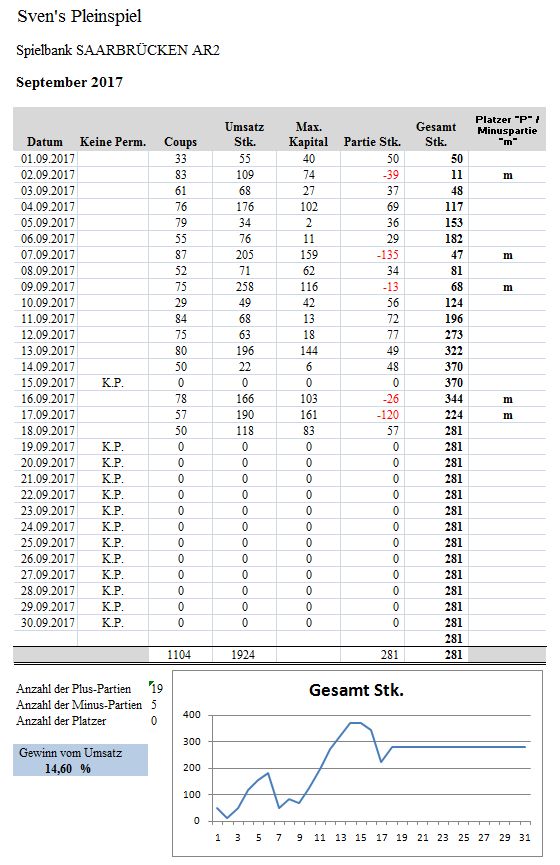 Roli888 Geschrieben Oktober 3, 2017 Geschrieben Oktober 3, 2017 (bearbeitet) Sven’s Pleinspiel Monatsauswertung Spielbank WIESBADEN T1 September 2017 Gesamtergebnis: - 677 Stk. bei täglich einer gespielten Partie ab dem 1. Tagescoup Coups: 1.849 Umsatz: 3.452 Stk. Gewinn vom Umsatz: -19,61 % Tischkapital: 200 Stk. Das Tischkapital von 200 Stk. wurde bei keiner einzigen Partie überschritten! Info: Alle Partien wurden nach bekannten Regeln ausgewertet. Pro Tag eine Partie beginnend mit dem ersten Tagescoup. Keine reinen Intuitivsätze. Die Auswertungen werden sicherlich zahlreiche Fehler beinhalten, wie das eben bei „Handauswertungen“ unvermeidbar ist. Jedoch Fehler gleichen sich immer wieder aus. Monatsstatistik mit Angabe der Coups - Umsatz und maximal benötigtes Tischkapital + Partie Saldo und Gesamt Ergebnis WIESBADEN T1 Auswertungs Stand Aug. 2017 + 470 Stk. Sept. 2017 - 677 Stk. ----------------------------------- Gesamt: - 207 Stk. Coups 3.483 Umsatz 6.611 Gewinn vom Umsatz: -3,13% bearbeitet Oktober 3, 2017 von Roli888