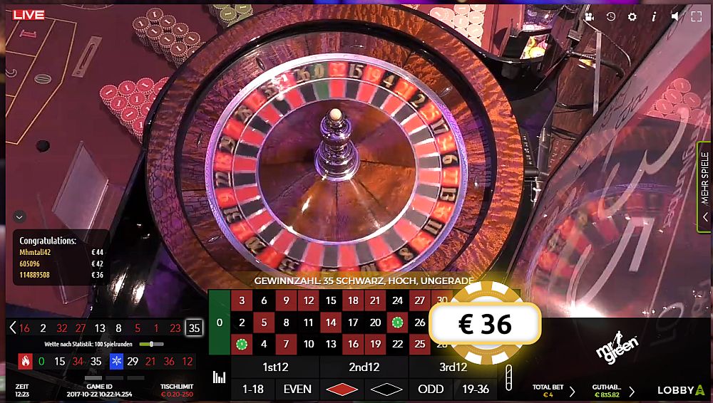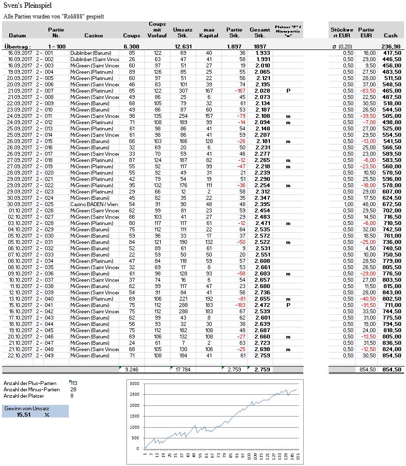 Roli888 Geschrieben Oktober 22, 2017 Geschrieben Oktober 22, 2017 2-049 Live-Partie Gespielt am 22.10.2017 im Mr.Green "Batumi" Live Casino Die Partie wurde nach 71 (mit Vorlauf 108) Coups mit +61 Stk. beendet. Vorlauf HR I 8, 33, 13, 31, 24, 24, 8, 4, 4, 26, 15, 15, 11, 11, 15, 33, 33, 15 HR II 9, 36, 24, 13, 28, 25, 0, 22, 34, 31, 28, 31, 0, 32, 17, 7, 19, 2, 32 Coup Zahl 01. 27 02. 34 03. 13 04. 35 05. 19 06. 0 07. 21 08. 9 09. 31 10. 14 11. 10 12. 22 13. 28 14. 34 1. 2er - Satzstart 15. 0 2. 2er 16. 7 17. 35 3. 2er 18. 10 ---- Ende 1. HR ----4. 2er 19. 20 20. 20 5. 2er 21. 6 22. 17 23. 31 6. 2er (ich nehme die "10" aus dem Spiel) (Satzerhöhung: 2 Stk. je Plein) 24. 20 TREFFER! Eingesetztes Angriff-Kapital: 41 Stk. Gezogen: +70 Stk. = Angriff-Gewinn: +29 Stk. Neuer Angriff ----------------------- Satz: 1 Stk. auf "20" 25. 14 26. 23 27. 1 28. 29 29. 30 30. 13 31. 25 32. 2 33. 35 2. 3er 34. 1 35. 0 3. 3er 36. 24 37. 5 ---- Ende 2. HR ---- 38. 18 39. 34 4. 3er 40. 17 41. 7 (Satzerhöhung: 2 Stk. je Plein) 42. 6 43. 23 44. 4 45. 22 (Satzerhöhung: 3 Stk. je Plein) 46. 25 47. 34 TREFFER! Eingesetztes Angriff-Kapital: 87 Stk. Gezogen: +105 Stk. = Angriff-Gewinn: +18 Stk. Neuer Angriff ---------------------- Satz: 1 Stk. auf "34" 48. 15 49. 8 50. 19 51. 4 52. 33 53. 30 54. 35 2. 4er 55. 3 ---- Ende 3. HR ---- 56. 26 57. 32 58. 23 59. 4 60. 11 61. 1 62. 16 63. 2 64. 32 65. 27 66. 13 67. 8 (Satzerhöhung: 2 Stk. je Plein) 68. 5 69. 1 3. 4er 70. 23 4. 4er 71. 35 TREFFER! Eingesetztes Angriff-Kapital: 56 Stk. Gezogen: +70 Stk. = Angriff-Gewinn: +14 Stk. PARTIE ENDE mit +61 Stk. 1. Angriff: +29 Stk. 2. Angriff: +18 Stk. 3. Angriff: +14 Stk. ------------------------------ Gesamt: +61 Stk. Coups: 71 (mit Vorlauf 108) Umsatz: 184 Stk. Buchungsblatt: 2-049_Partie.pdf Screenshots: Vorlauf Ende Partie Ende Statistik