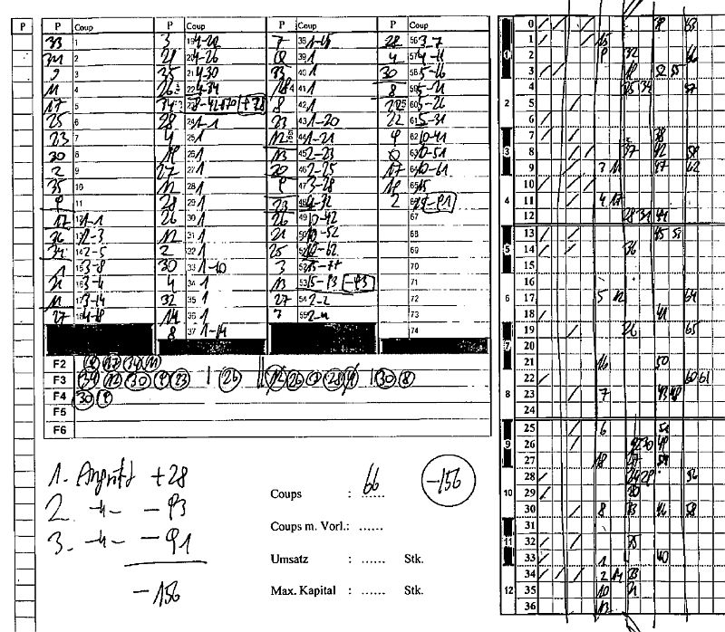 Take_7 Geschrieben Oktober 27, 2017 Geschrieben Oktober 27, 2017 (bearbeitet) vor 8 Stunden schrieb Roli888: @Take_7 Ich hab mir nun Deine Partie vom 24.10. angesehen und durchgespielt. Ich habe Deine Angaben zugedeckt und nur auf die Zahlen geschaut. Die Pleinselektion habe ich auch so wie Du gemacht. Also nach Coup 49 "26" habe ich auch die "12" aus dem Angriff genommen. Auch dann beim Angriff nach dem Coupfenster Cut habe ich die "12" und "4" aus dem Angriff genommen, da sie sehr leicht zu erkennen waren. Nützte aber alles nicht's denn es wurden in der Partie 2 Minusangriffe produziert. Also ist ab Coup 66 Partie mit -156 (Du hast -166) Schluß. Bei der Saldoberechnung komme ich im 1. Angriff auf +28 Stk. 2. Angriff auf -91 und du hast -101. Der Unterschied liegt darin, das ich sofort nach dem Minusangriff den Coupfenster Cut gemacht habe und die beiden F3 "12" und "26" gespielt habe. Daher erreichte ich ab Coup 66 mit zwei Pleinsäze a 3 Stk. schon die -91 und beendete die Partie. Du hast alles richtig gespielt. Die Angriffsaldo vom 1. Angriff kann man noch mal ansehen. Gruß: Roli888 Erstmal vielen Dank, dass du dir das Spiel so genau angesehen hast. Für solche schwierigen Situationen bringt so ein Austausch wirklich viel. Nach Coup 49 hatte ich die neu erschienene "26" dazu genommen und die "34" raus genommen. Hatte damals gedacht die "34" hat schon ihr Bestes gegeben, wurde lange nicht getroffen und kühlt nun ab... Im Nachhinein betrachtet ist es wahrscheinlich grundsätzlich besser so wie du es gemacht hast, also die "26" nicht mit rein zu nehmen, da sie nur lückenhaft erschienen ist und besser die "34" weiter zu setzen, da sie zumindest auf zwei Stufen BIN-reif war. Ich habe in einigen vergangenen Spielen aufgrund von zwei Minusangriffen mehrmals das Tischkapital überschritten und dadurch evtl. zu viel Kapital verbrannt. Wie machst du das aktuell, wenn nach einem misslungenen erweiterten Angriff der nächste Angriff auch langsam ans Limit stößt? Brichst du dann wie damals das Spiel im laufenden Angriff bei -200 Stk. ab? bearbeitet Oktober 27, 2017 von Take_7