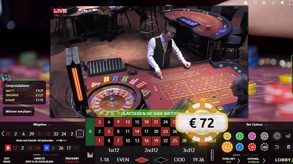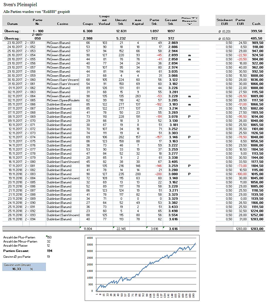 Roli888 Geschrieben November 26, 2017 Geschrieben November 26, 2017 2-094 Live-Partie Gespielt am 26.11.2017 im Dublinbet BATUMI (Tisch 2) Live Casino Die Partie wurde nach 40 (mit Vorlauf 77) Coups mit +62 Stk. beendet. Vorlauf HR I 28, 34, 16, 10, 9, 23, 10, 4, 14, 5, 2, 8, 7, 7, 2, 15, 18, 11, HR II 34, 26, 11, 29, 14, 21, 28, 28, 12, 27, 0, 33, 11, 20, 36, 13, 2, 11, 29 Coup Zahl 01. 36 02. 34 03. 30 04. 7 05. 19 06. 22 07. 3 08. 14 09. 33 10. 28 11. 12 12. 36 1. 2er - Satzstart 13. 36 TREFFER! Eingesetztes Angriff-Kapital: 1 Stk. Gezogen: +35 Stk. = Angriff-Gewinn: +34 Stk. Wartephase 14. 7 15. 34 16. 13 17. 34 18. 20 ---- Ende 1. HR ---- 19. 10 20. 18 21. 31 Der Coup vor dem nächsten Angriff Start. 1er - warten… 22. 10 F2 Favo - Signal zum nächsten Angriff Neuer Angriff ---------------------- Satz: 1 Stk. auf "36" 23. 14 24. 19 25. 21 26. 6 27. 34 2. 3er 28. 14 3. 3er 29. 19 4. 3er 30. 6 31. 25 32. 2 33. 6 5. 3er 34. 29 (Satzerhöhung: 2 Stk. je Plein) 35. 5 36. 12 37. 33 (Satzerhöhung: 3 Stk. je Plein) ---- Ende 2. HR ---- 38. 24 39. 2 Erweiterter Angriff: (bis 140 Stk. Angriffskapital) da 2 Coups vor der Treffer-Erwartung nach der BIN 40. 36 TREFFER! Eingesetztes Angriff-Kapital: 112 Stk. Gezogen: +140 Stk. = Angriff-Gewinn: +28 Stk. PARTIE ENDE mit +62 Stk. 1. Angriff: +34 Stk. 2. Angriff: +28 Stk. ------------------------------ Gesamt: +62 Stk. Coups: 40 (mit Vorlauf: 77) Umsatz: 113 Stk. Buchungsblatt: Screenshot: Partie Ende Statistik: 2-094_Partie.pdf