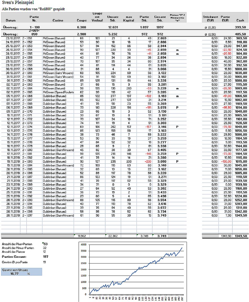 Roli888 Geschrieben November 29, 2017 Geschrieben November 29, 2017 2-096 Live-Partie Gespielt am 28.11.2017 im Dublinbet BATUMI (Tisch 1) Live Casino Die Partie wurde nach 58 (mit Vorlauf 95) Coups mit +62 Stk. beendet. Vorlauf HR I 25, 31, 1, 10, 9, 15, 18, 23, 12, 21, 36, 21, 10, 33, 16, 4, 2, 36, HR II 18, 29, 5, 13, 24, 9, 17, 36, 24, 36, 2, 29, 34, 18, 6, 32, 9, 13, 24 Coup Zahl 01. 27 02. 8 03. 13 04. 0 05. 0 1. 2er - Satzstart 06. 4 07. 29 08. 1 09. 34 10. 14 11. 10 12. 13 2. 2er 13. 33 14. 29 3. 2er 15. 6 16. 35 17. 23 18. 6 4. 2er ---- Ende 1. HR ---- 19. 1 5. 2er 20. 32 (Satzerhöhung: 2 Stk. je Plein) 21. 19 22. 0 TREFFER! Eingesetztes Angriff-Kapital: 52 Stk. Gezogen: +70 Stk. = Angriff-Gewinn: +18 Stk. Neuer Angriff ----------------------- Satz: 1 Stk. auf "0" 23. 35 24. 10 25. 31 26. 31 27. 1 28. 0 TREFFER! Eingesetztes Angriff-Kapital: 7 Stk. Gezogen: +35 Stk. = Angriff-Gewinn: +28 Stk. Wartephase… 29. 9 30. 8 31. 19 32. 2 33. 25 34. 36 35. 17 36. 10 37. 14 ---- Ende 2. HR ---- 38. 25 39. 17 40. 1 2. F4 - Wartephase wird um 3 Coups verlängert 41. 7 42. 29 43. 11 Der Coup vor dem nächsten Angriff. "11" 1er - warten... 44. 24 1er - warten… 45. 36 F2 - Favo Signal zum Angriff Neuer Angriff ------------------- Satz: 1 Stk. auf "0" Hinweis: Eigentlich wären "0" und "1" zu setzen gewesen. Ich habe in der Partie die "1" vergessen zu setzen. Dieser Fehler wirkte sich nicht negativ aus, auch bei Satz "1" und "0" wäre der Angriff positiv verlaufen. 46. 4 47. 26 48. 14 49. 33 50. 35 51. 9 52. 29 2. (3.) 4er 53. 26 54. 19 55. 30 ---- Ende 3. HR ---- 56. 21 57. 30 58. 0 TREFFER! Eingesetztes Angriff-Kapital: 19 Stk. Gezogen: +35 Stk. = Angriff-Gewinn: +16 Stk. PARTIE ENDE mit +62 Stk. 1. Angriff: +18 Stk. 2. Angriff: +28 Stk. 3. Angriff: +16 Stk. ------------------------------ Gesamt: +62 Stk. Coups: 58 (mit Vorlauf: 95) Umsatz: 78 Stk. Buchungsblatt: 2-096_Partie.pdf Screenshot: Partie Ende