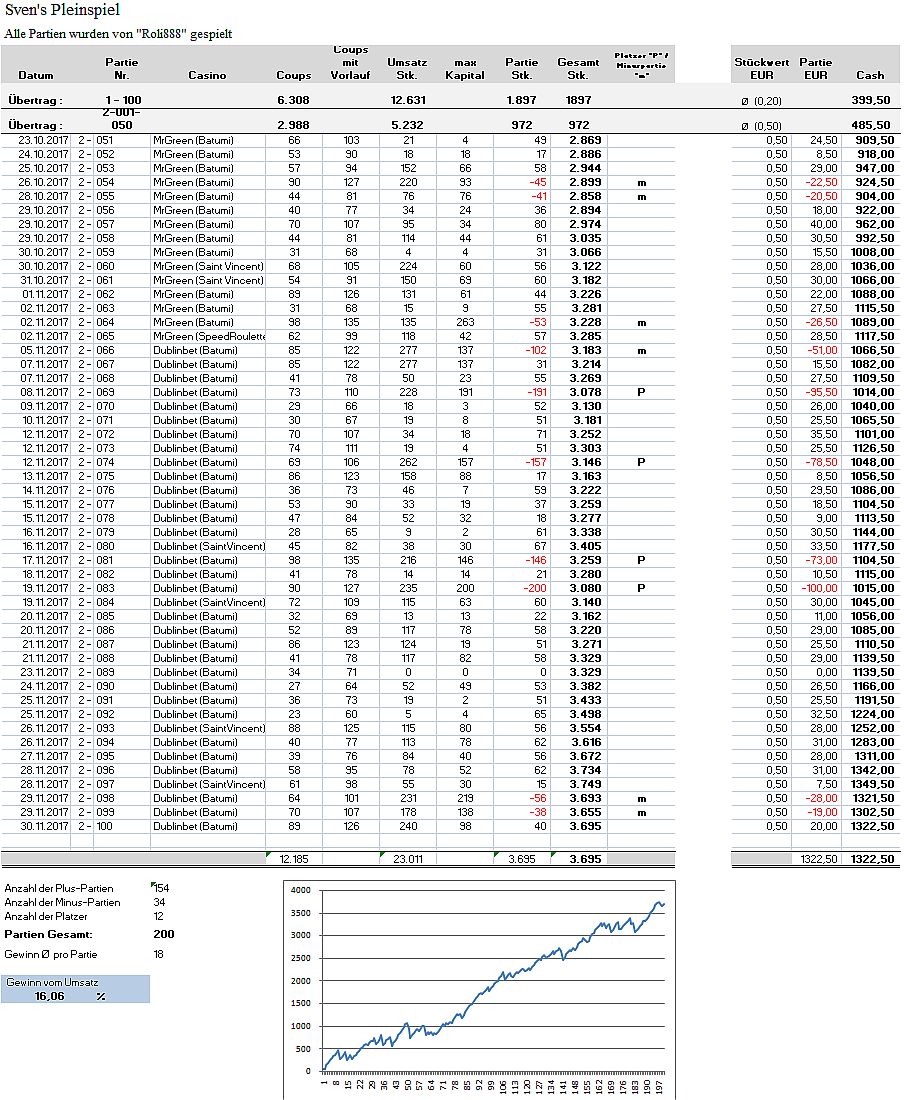 Roli888 Geschrieben November 30, 2017 Geschrieben November 30, 2017 2-099 Live-Partie Gespielt am 29.11.2017 im Dublinbet BATUMI (Tisch 1) Live Casino Die Partie wurde nach 64 (mit Vorlauf 101) Coups mit -56 Stk. beendet. Vorlauf HR I 5, 7, 27, 35, 6, 33, 6, 2, 2, 30, 0, 7, 7, 12, 1, 17, 26, 5, HR II 29, 4, 10, 34, 25, 19, 29, 13, 8, 27, 8, 10, 3, 1, 33, 12, 9, 11, 27 Coup Zahl 01. 7 02. 24 03. 0 04. 8 05. 24 1. 2er - Satzstart 06. 27 07. 11 08. 3 09. 33 10. 20 11. 22 12. 0 2. 2er 13. 3 3. 2er "Pleinlücke" Sektorsatz ["26"-1-1] 14. 8 4. 2er 15. 35 16. 19 17. 17 18. 1 ---- Ende 1. HR ---- (Satzerhöhung: 2 Stk. je Plein) 19. 14 20. 31 21. 13 (Satzerhöhung: 3 Stk. je Plein) 22. 20 23. 17 24. 13 Erweiterter Angriff, da erst 1 Coup über der Treffer-Erwartung nach der BIN (Satzerhöhung: 4 Stk. je Plein) 25. 24 TREFFER! Eingesetztes Angriff-Kapital: 133 Stk. Gezogen: +140 Stk. = Angriff-Gewinn: +7 Stk. Neuer Angriff ----------------------- Satz: 1 Stk. auf "24" 26. 23 27. 35 28. 21 29. 6 30. 8 2. 3er 31. 26 32. 5 33. 33 34. 20 3. 3er 35. 21 36. 35 4. 3er 37. 7 ---- Ende 2. HR ---- 38. 30 39. 16 (Satzerhöhung: 2 Stk. je Plein) 40. 18 41. 27 42. 5 43. 15 (Satzerhöhung: 3 Stk. je Plein) 44. 11 45. 30 Angriff-Ende -93 Stk. Coupfenster Cut noch nicht möglich da nach visuellem ausblenden der 1. HR keine AngriffSignale da sind. 46. 20 1. F4 (!) Neuer Angriff ----------------------- Satz: 1 Stk. auf "20" 47. 13 48. 30 49. 29 50. 26 51. 20 TREFFER! Eingesetztes Angriff-Kapital: 5 Stk. Gezogen: +35 Stk. = Angriff-Gewinn: +30 Stk. Wartephase… 52. 1 53. 33 54. 0 55. 7 ---- Ende 3. HR ---- 56. 14 57. 12 58. 3 59. 11 60. 34 61. 32 62. 33 63. 9 Der Coup vor dem nächsten Angriff - "9" 1er - warten… 64. 20 1. F6 (!) während der Wartephase PARTIE ENDE mit -56 Stk. 1. Angriff: + 7 Stk. 2. Angriff: -93 Stk. 3. Angriff: +30 Stk. ------------------------------ Gesamt: -56 Stk. Coups: 64 (mit Vorlauf: 101) Umsatz: 231 Stk. Buchungsblatt: 2-099_Partie.pdf Screenshot: Partie Ende Statistik