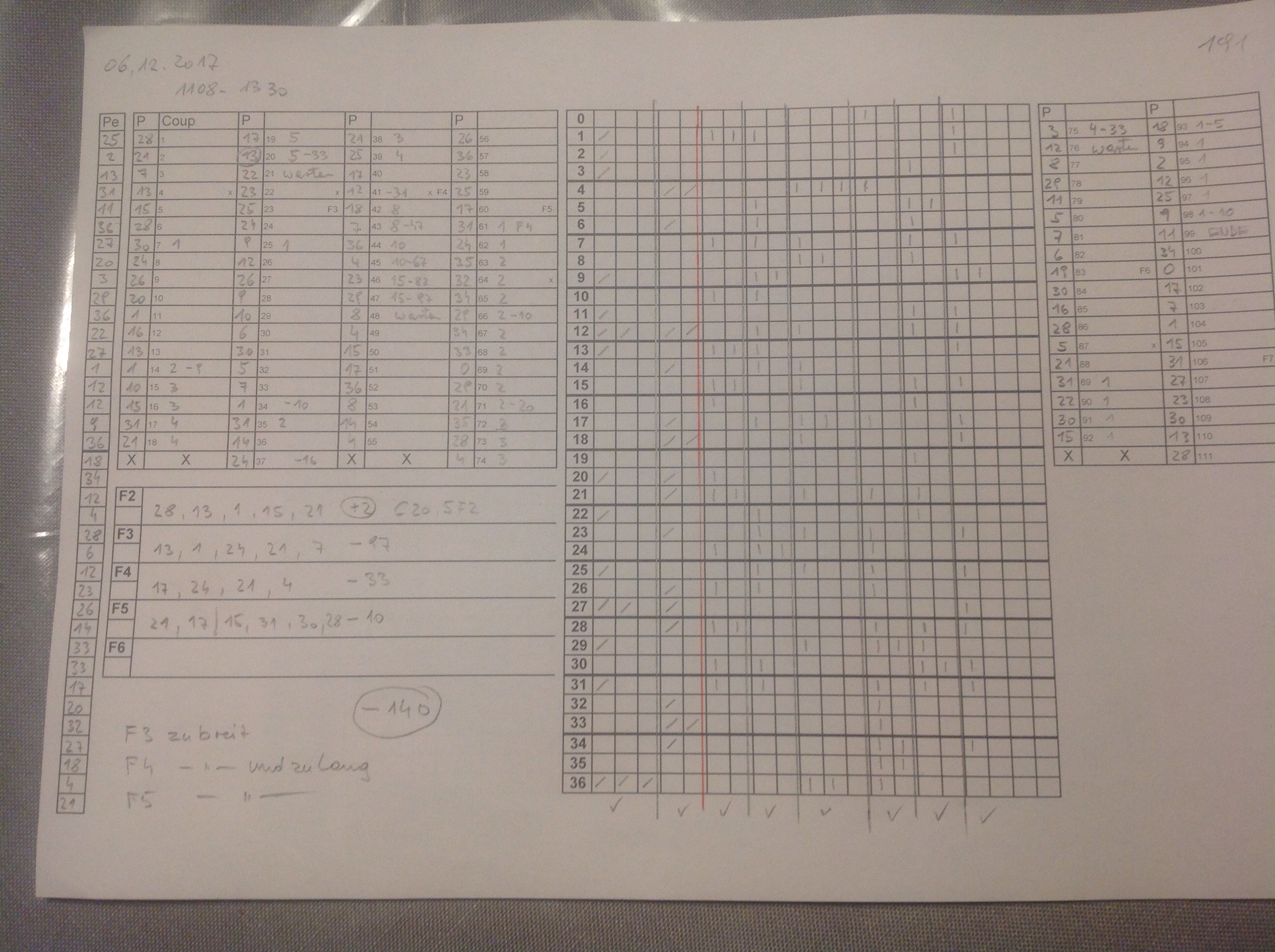 Take_7 Geschrieben Dezember 8, 2017 Geschrieben Dezember 8, 2017 (bearbeitet) Falls es jemanden interessiert, ich habe in die letzte Demo-Partie noch den fortlaufenden Saldo eingetragen und einige Überlegungen hinzugefügt. Die 12 hätte ich mit meinem aktuellen Kenntnisstand allerdings nicht erwischt: "Mit Vorlauf (86 Coups) ist die 12 bereits 6x erschienen, ab der 2. Vorlauf-HR (66 Coups) ist die 12 zusammen mit 4 ein F4. Im ersten Fall wäre ein Angriff auf F7 möglich, im zweiten Fall sind wir schon 7 Coups über BIN-Erwartung für den F5. Beides würde ich als nicht optimal einschätzen." Nach dem Treffer in Coup 61 gibt es eine alternative Angriffsmöglichkeit, die ich aber auch im Nachhinein betrachtet nicht gewählt hätte: "ab der 2. Vorlauf-HR (79 Coups) gibt es die beiden F5 4 und 17. Diese sind zugleich F3 in den letzen beiden HRs und zwar dort im Coup 23. Letzeres hätte ich als Warnsignal gewertet, da der F3 schon für da war. Wie man gleich sieht, trifft die 4 dann doch und wird zum F6 (93. Coup) bzw. F4 (37. Coup) ...". Hier komme ich irgendwie nicht weiter und solche ähnlichen Permanenzen sehe ich ziemlich oft . bearbeitet Dezember 8, 2017 von Take_7