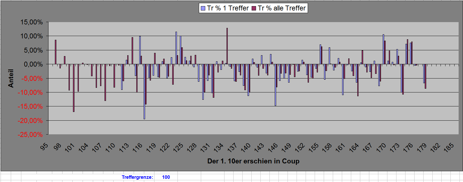 elementaar Geschrieben Dezember 14, 2017 Geschrieben Dezember 14, 2017 Hallo FavRad, Am 13.12.2017 um 17:09 schrieb FavRad: Was habe ich gemacht? Angeregt durch die Diskussion hier, habe ich ein Jahr über 5 Rotationen aufgeschlüsselte Permanenzen, in der warmen Wintersonne sitzend, durchgeblättert und notiert, in welchem Coup ein 10er kam und wann er zum 11er wurde - oder eben nicht. An den ca. 355 Tagen kam in 246 Fällen ein Zehner. Im overall Durchschnitt bereits im 153. Coup anstatt im ca. 177. In 102 Fällen kam die Zahl nicht mehr bis zum Ende der 5 Rotationen, also bis zum 185. Coup. Das durchschnittliche Erscheinen hier ist der 164. Coup. Gesamtergebnis -2077. In 144 Fällen kam der 11er. Hier ist das durchschnittliche Erscheinen im 145. Coup!!!!!! Also viiieeel zu früh. Ergebnis hier 2822. Besonders interessant daran finde ich, dass, je näher das Erscheinen an der zu erwartenden Stelle auftritt, desto schlechter ist das Ergebnis. Die Ergebniskurve zeigt das Resultat einer zunächst super simplen Berechnung: 10er wird angegriffen entweder bis er trifft oder bis Coup 185. Full stop. Keine Verfeinerung, Angriffsbegrenzung or whatever. Ich bin sprachlos. Jetzt müsst Ihr mit Eurer geballten Logik mir das widerlegen Dass ein Jahr nicht viel ist, weiss ich. Trotzdem! LG FavRad unten siehst Du, was passiert, wenn man Deinen Prüfvorschlag mit RND-Zahlen ("bester" Zufall "tadelloser Qualitätsbeschaffenheit") durchgeht. Die summierten Ergebnisse beziehen sich auf zwei Varianten: einmal genau, wie von Dir beschrieben (Abwarten des 1. 10ers; dann Spiel auf einen Treffer, Abbruch sofort danach; benannt mit "1 Treffer"), einmal mit Weiterspielen selbst mit Treffer bis Coup 185; benannt mit "alle Treffer". Beide Male begrenzt auf die maximale Spielstrecke von 185 Coups (5 Pleinrotationen). Um nun zeitgleich die von Dir gemachten Beobachtungen über evtle Ergebnisauswirkungen in Abhängigkeit zum Erscheinenszeitpunkt des 1. 10ers untersuchen zu können, habe ich diesmal Umsatz, Trefferanzahl und Ergebnis lediglich als Gesamtergebnis summiert, und dafür aufgeschlüsselt aufzeichnen lassen, was nach jedem Erscheinenszeitpunkt des 1. 10ers geschieht. Damit man in dem Diagramm überhaupt noch etwas zu erkennen vermag, sind die Trefferquoten in [%] aufgetragen (3% Trefferquote mit EZ bedeuten (ohne Tronc) 8% Ergebnisplus vom Umsatz). Außerdem sind lediglich Startpunkte verzeichnet, die mindestens 100 Treffer erzielen konnten (Treffergrenze). Die natürlichen Schwankungen sind aber auch damit noch hoch. Gruß elementaar