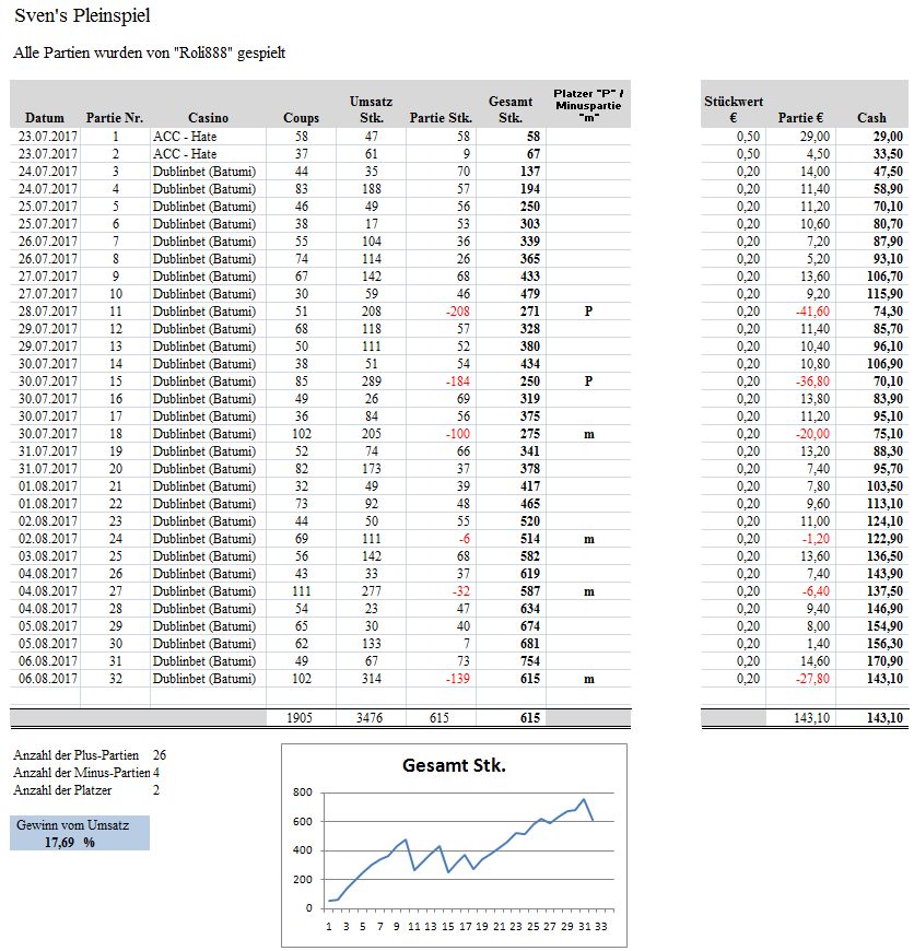 Roli888 Geschrieben August 6, 2017 Geschrieben August 6, 2017 38. Auswertungs-Partie Statistik Partie: Nr.: 32 Gespielt am 06.08.2017 im Dublinbet (Batumi) Live Casino Die Partie wurde nach 102 Coups mit -139 Stk. beendet. Coup Zahl 01. 0 02. 33 03. 10 04. 24 05. 14 06. 33 1. 2er - Satzstart 07. 27 08. 6 09. 17 10. 4 11. 28 12. 1 13. 14 2. 2er 14. 35 15. 9 16. 32 17. 19 18. 32 3. 2er ---- Ende 1. HR ---- 19. 6 4. 2er 20. 22 21. 11 22. 5 (Satzerhöhung 2 Stk. pro Plein) 23. 1 5. 2er 24. 8 25. 10 6. 2er TVP-Abgleich ("14" fällt raus) 26. 27 7. 2er TVP-Abgleich ("27" fällt raus) (Satzerhöhung auf 3 Stk. pro Plein) 27. 33 TREFFER! Eingesetztes Angriffs-Kapital: 85 Stk. Gezogen: +105 Stk. = Angriff-Gewinn: +20 Stk. Neuer Angriff ---------------------- 1 Stk. auf "33" 28. 35 29. 34 30. 15 31. 4 32. 35 2. 3er 33. 35 TREFFER! Eingesetztes Angriffs-Kapital: 7 Stk. Gezogen: +35 Stk. = Angriff-Gewinn: +28 Stk. Früher F4 - Wartephase Hier wäre schon eine gute Gelegenheit gewesen die Partie zu beenden ich spielte aber weiter 34. 21 35. 19 36. 22 37. ---- Ende 2. HR ---- 38. 25 39. 2 40. 9 41. 19 "19" solider Favo - Einstiegssignal Neuer Angriff ---------------------- 1 Stk. auf "35" 42. 34 43. 21 44. 33 2. 4er 45. 18 46. 8 47. 16 48. 17 49. 13 50. 34 51. 29 52. 21 53. 21 3. 4er 54. 30 55. 0 ---- Ende 3. HR ---- 56. 6 57. 3 (Satzerhöhung 2 Stk. je Plein) 58. 5 59. 20 60. 20 61. 18 62. 19 (Satzerhöhung 3 Stk. je Plein) 63. 7 64. 22 65. 10 Ich beende hier den Angriff mit -99 Stk. Ich bin bereits 5 Coups über die BIN Treffer-Erwartung und bereits 3 Sätze mit je 3 Stk. pro Plein gemacht. Bei den beiden vorigen Angriffen habe ich bereits +48 Stk. erzielt so dass das Minus nicht so extrem ist. Wartephase ... 66. 7 Ich mache einen "Coupfenster Cut" (HR 1,2,3 werden visuell abgeschnitten) und spiele die F2 auf F3 mit neuen Zahln die bisher noch nicht als Favos im Spiel waren. Faktisch so als ob ich das Spiel erst innerhalb der letzten HR gestartet habe. Einstieg zum Neuen Angriff -------------------------------------------- 1 Stk. "20" 67. 10 2. 2er 68. 24 69. 1 70. 31 71. 28 72. 27 73. 36 74. 17 ---- Ende 4. HR ---- 75. 8 76. 18 77. 18 TREFFER! Eingesetztes Angriffs-Kapital: 33 Stk. Gezogen: +35 Stk. = Angriff-Gewinn: +2 Stk. Neuer Angriff --------------------- 1 Stk. "18" 78. 9 79. 29 80. 17 81. 1 82. 22 83. 17 2. 3er 84. 11 85. 30 86. 35 87. 13 88. 2 89. 30 90. 5 91. 6 92. 4 ---- Ende 5. HR ---- 93. 7 3. 3er 94. 12 95. 4 (Satzerhöhung 2 Stk. pro Plein) 96. 13 97. 24 98. 13 4. 3er 99. 2 100. 9 (Satzerhöhung 3 Stk. pro Plein) 101. 29 102. 8 Hier beende ich den Angriff mit -90 Stk. Ich befinde mich 6 Coups über der BIN Treffer-Erwartung und müsste beim nächsten Satz schon 4 Stk. pro Plein setzen. 2 Sätze mit a 4 Stk. pro Plein hätte ich dann noch einsetzen können bis das Tischkapital von ca. 200 Stk. aufgebraucht ist. In diesem Fall entscheide ich mich den Angriff mit den -90 Stk. zu beenden. PARTIE ENDE mit -139 Stk. 1. Angriff: +20 Stk. 2. Angriff: +28 Stk. 3. Angriff: -99 Stk. 4. Angriff: + 2 Stk. 5. Angriff: -90 Stk. ------------------------------ Gesamt: - 139 Stk. Coups: 102 Umsatz: 314 Stk. Buchungsblatt: 38_Partie.pdf Screenshots: Partie Starpermanenz 5 Coups nach Ende der Partie Statistik