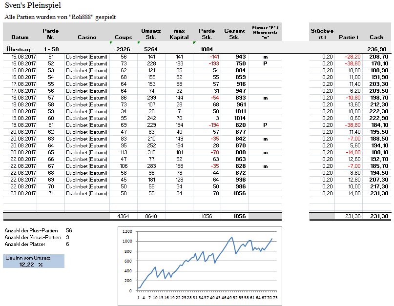 Roli888 Geschrieben August 25, 2017 Geschrieben August 25, 2017 79. Auswertungs-Partie Statistik Partie Nr.: 73 Gespielt am 24.08.2017 im Dublinbet (Batumi) Live Casino Die Partie wurde nach 76 Coups mit +63 Stk. beendet. Coup Zahl 01. 24 02. 34 03. 7 04. 1 05. 26 06. 11 07. 20 08. 15 09. 24 1. 2er - Satzstart 10. 1 2. 2er 11. 18 12. 17 13. 16 14. 13 15. 26 16. 1 TREFFER! Eingesetztes Angriffs-Kapital: 14 Stk. Gezogen: +35 Stk. = Angriff-Gewinn: +21 Stk. Frühzeitiger F3 - Wartephase … 17. 16 18. 4 ---- Ende 1. HR ---- 19. 18 20. 3 21. 36 Coup 20 und Coup 21 1er - warten… 22. 26 "26" F2 Favo. Startsignal Neuer Angriff ------------------- Satz: 1 Stk. "1" 23. 26 2. 3er 24. 28 25. 35 26. 35 27. 4 28. 28 29. 29 30. 1 TREFFER! Eingesetztes Angriffs-Kapital: 15 Stk. Gezogen: +35 Stk. = Angriff-Gewinn: +20 Stk. Frühzeitiger F4 - Wartephase … 31. 2 32. 7 33. 14 34. 19 35. 24 36. 0 37. 1 Sehr frühzeitiger F5 - längere Wartephase… Diesmal mache ich keinen Coupfenster Cut um bereits erschienene Stufen neu anzugreifen, sondern warte ab. Spitzes Spiel = Keine Cuts - warten Breites Spiel = Durch Coupfenster Cuts bessere Favos nach der BIN erkennen und angreifen ---- Ende 2. HR ---- 38. 34 39. 19 40. 2 41. 33 42. 6 43. 14 44. 21 45. 25 46. 24 47. 4 48. 5 49. 23 50. 14 51. 11 52. 23 53. 36 54. 13 55. 3 ---- Ende 3. HR ---- 56. 19 57. 0 58. 3 59. 0 60. 23 61. 36 62. 27 63. 18 "18" solider F3 in allen Coupfenster vorhanden. 20 Coups vor der Treffer-Erwartung (F6) nach der BIN. Neuer Angriff ------------------- Satz: 1 Stk. "1" 64. 25 65. 13 66. 30 67. 22 68. 6 69. 16 70. 21 71. 30 72. 2 73. 8 74. 19 ---- Ende 4. HR ---- 75. 21 76. 1 TREFFER! Eingesetztes Angriffs-Kapital: 13 Stk. Gezogen: +35 Stk. = Angriff-Gewinn: +22 Stk. PARTIE ENDE mit +63 Stk. 1. Angriff: +21 Stk. 2. Angriff: +20 Stk. 3. Angriff: +22 Stk. ------------------------------ Gesamt: +63 Stk. Coups: 76 Umsatz: 42 Stk. Buchungsblatt: 79_Partie.pdf Screenshots: Coup 16 - Treffer Partie Ende Statistik