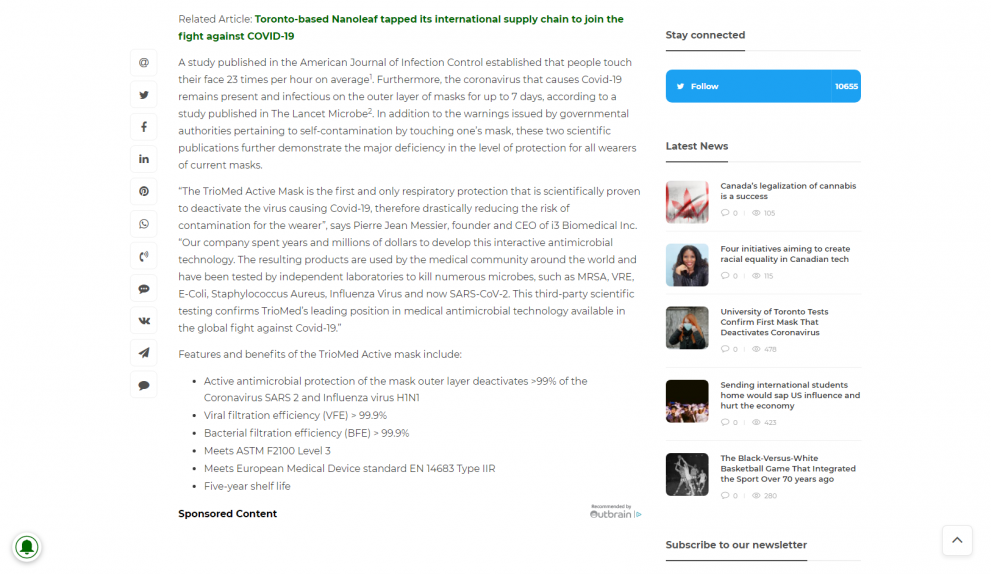 Café Geschrieben Juli 21, 2020 Geschrieben Juli 21, 2020 (bearbeitet) Mindestens 99,9 % Virenschutz “The TrioMed Active Mask is the first and only respiratory protection that is scientifically proven to deactivate the virus causing Covid-19, therefore drastically reducing the risk of contamination for the wearer”, says Pierre Jean Messier, founder and CEO of i3 Biomedical Inc. “Our company spent years and millions of dollars to develop this interactive antimicrobial technology. The resulting products are used by the medical community around the world and have been tested by independent laboratories to kill numerous microbes, such as MRSA, VRE, E-Coli, Staphylococcus Aureus, Influenza Virus and now SARS-CoV-2. This third-party scientific testing confirms TrioMed’s leading position in medical antimicrobial technology available in the global fight against Covid-19.” https://panamericanworld.com/en/magazine/startups/university-of-toronto-tests-confirm-first-mask-that-deactivates-coronavirus/ Deutsch: " 'Die TrioMed Active Mask ist der erste und einzige Atemwegsschutz, der wissenschaftlich bewiesen das COVID-19-verursachende Virus (Sars-Cov-2, Café) deaktiviert, das Risiko des Trägers also drastisch reduziert, sich zu infizieren' sagte Pierre Jean Messier, Gründer und Geschäftsführer von "i3 Biomedical Inc."- 'Unsere Gesellschaft hat Jahre und Millionen von Dollar investiert, um diese interaktive antimikrobielle Technologie zu entwickeln. Die daraus entstandenen Produkte werden von medizinischen Community in der ganzen Welt genutzt und sind durch unabhängige Laboratorien getestet worden, um zahlreiche Mikroben wie MRSA, VRE, E-Coli, Staphylococcus Aureus, Influenza-Virus und jetzt SARS-CoV-2 zu töten. Diese durch Dritte durchgeführte wissenschaftliche Testung bestätigt TrioMed's führende Position in der verfügbaren medizinischen antimikrobiellen Technologie im globalen Kampf gegen Covid-19.' " Wohlgemerkt: Der Träger der Maske selbst wird zu mehr als 99,9 % vor Viren geschützt, nicht umgekehrt - also nicht die anderen werden geschützt vor Dir, aber auch, wie dies jetzt der Fall angeblich sein soll. Und das Ganze auch noch ohne hermetisch abdichtende Gesichtsmasken, also wie bei den jetzigen Masken - als Tuch. Hier auch noch die Anschrift: I3 Biomedical Inc. 14163 Boul. Labelle Ste 50 Mirabel J7J1M Kanada https://www.bizapedia.com/trademarks/triomed-88324159.html https://i3biomedical.com Café bearbeitet Juli 21, 2020 von Café