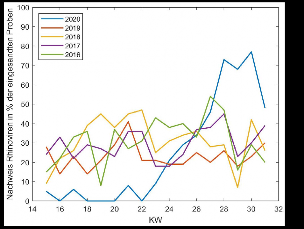 "(...) Die Aktivität von Rhinoviren im Jahre 2020 ist ungewöhnlich im Vergleich zu den Vorjahren. Bis Ende Mai (KW 22) ist eine äußerst geringe Aktivität zu verzeichnen, mit einem steilen Anstieg im Juni sowie einer herausragend hohen Aktivität im Juli. Die Gründe für das ungewöhnliche Verhalten sollen hier nicht betrachtet werden. Jedoch erlaubt gerade dieses Verhalten besonders signifikante Schlußfolgerungen hinsichtlich der Wirkung von MNS (Alltagsmasken) auf die Aktivität von Rhinoviren in der Bevölkerung Deutschlands im Jahr 2020.