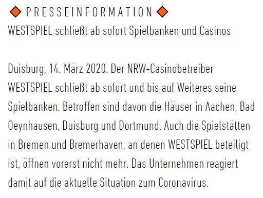 4-4Zack Geschrieben März 15, 2020 Geschrieben März 15, 2020 vor 17 Stunden schrieb Rabe1: Die Bayerischen Spielbanken sind bis einschließlich 19. April 2020 geschlossen. Mit dieser Entscheidung leisten die Bayerischen Spielbanken einen bewussten und proaktiven Beitrag zur Eindämmung und Verlangsamung der Ausbreitung des Coronavirus (COVID-19). Oberste Priorität haben die Gesundheit unserer Gäste sowie Mitarbeiterinnen und Mitarbeiter. Wir danken für Ihr Verständnis! Quelle https://www.spielbanken-bayern.de/custom/index/sCustom/95