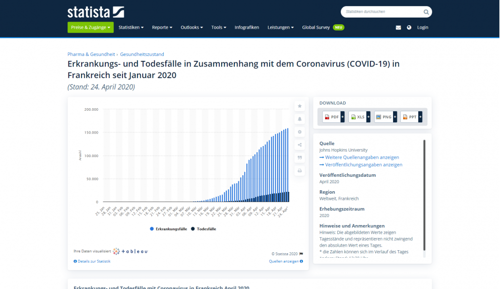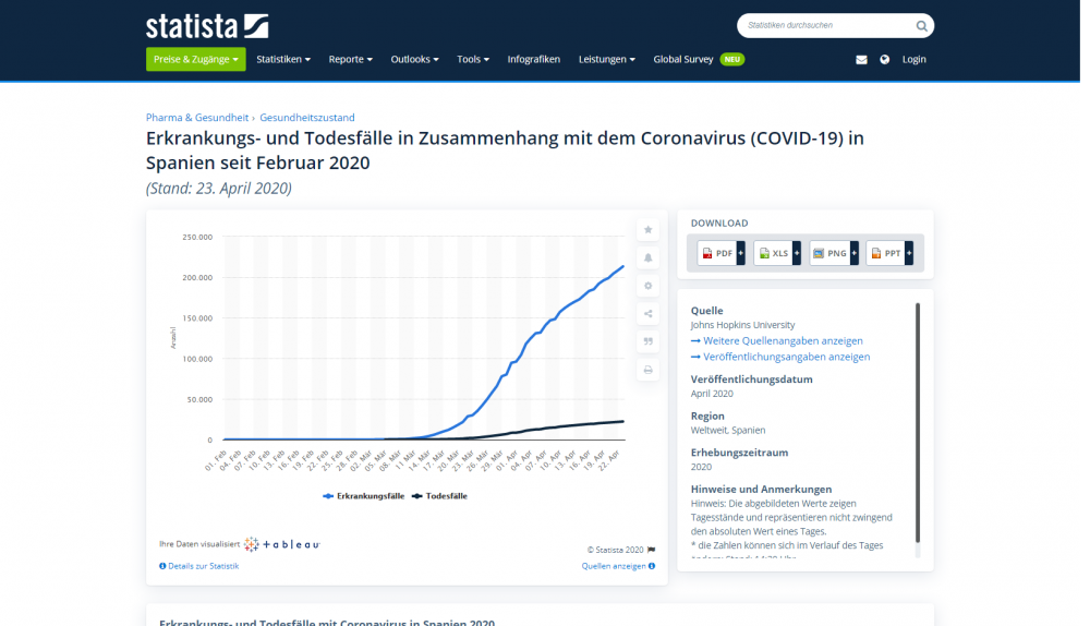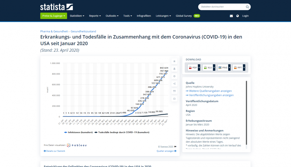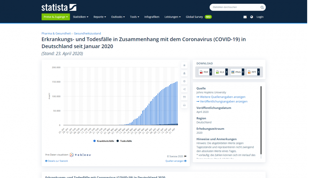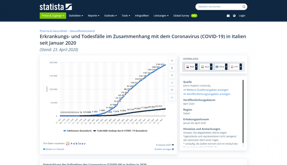 Hans Dampf Geschrieben April 25, 2020 Geschrieben April 25, 2020 Coronavirus in Deutschland Infektionen 154.999 Genesene 109.800 Todesfälle 5.760 Verdopplungszeit 53,0 Tage Quelle: Johns-Hopkins-Universität | Stand: 25.04.2020 09:30 Uhr