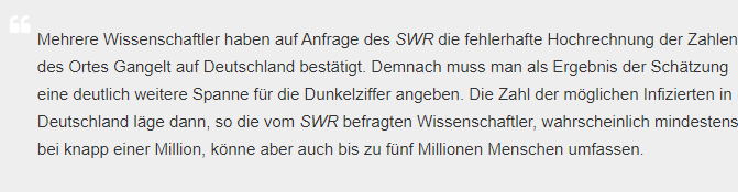 Café Geschrieben Mai 12, 2020 Geschrieben Mai 12, 2020 (bearbeitet) Leider ließ sich kein Snapshot machen. Die Software des Tagesspiegels registrierte den Scanversuch. Jetzt halt so. Weniger gut. Während Streeck von 1,8 Millionen Infizierten in ganz Deutschland mutmaßt, gehen andere Mutmaßungen anderer Wissenschaftler von 1 bis 5 Millionen aus. Im Fokus des Interesses steht dabei natürlich die Sterblichkeitsrate. Und diese wiederum ist ein Ort der politischen Auseinandersetzung hinsichtlich der Sinnhaftigkeit irgendwelcher Maßnahmen. Die in der Öffentlichkeit gehandelten Personengruppen wußten bereits vor der Krönung über ihre Verletzbarkeit Bescheid. Wie Wodarg schon darstellte, wurde diesen Personengruppen ärztlicherseits zu eigenen Vorsichtsmaßnahmen geraten. Insofern ist die Krönung für diesen Personenkreis nichts Neues, da sie ja bereits mit anderen Bedrohungsquellen zu tun hatten. Das ganze Theater um die Krönung führte eher zu einer Verschlechterung ihrer Lebensumstände, da sie weniger selbstbestimmt handeln konnten, weil sie ja als verwundbar gelten. Man denke an Immunerkrankungen oder Immununterdrückungen durch Krebstherapien uvm. In einem ZEIT-Interview mit älteren Prominenten vor ca. einem Monat machte Ströbele deutlich, daß er vor das Bundesverfassungsgericht ziehen wird, falls man ihn anders als den Rest der Gesellschaft behandeln sollte. D.h. ein Verwundbarer will eben selbst bestimmen, wie er sein Leben zu führen hat. D.h. wer aus einem Schutzbedürfnis heraus drinnen bleiben möchte, Hilfen haben möchte, der soll es auch dürfen und er sollte entsprechende Hilfen bekommen. Das alles kostet wesentlich weniger, als den ganzen Laden dicht zu machen. Hinzu kommt, daß man eben auch selbst etwas machen kann. Gerade Ältere haben durch ihre Lebenserfahrung einen Eindruck bekommen, wie gut das eigene Immunsystem ist. Wer sowieso kränklich ist, weiß selbst, daß er etwas tun muß, um sein Immunsystem hochzuhalten und zu fördern. Angst reduziert die Wehrhaftigkeit enorm. ( https://www.gesundheitsstadt-berlin.de/angst-beeinflusst-das-immunsystem-11769/ ) Genau diese ist aber mit allen Mitteln in den vergangenen zwei Monaten erzeugt worden. "Nachträge (9. 05. 2020): Hier ein Link zu einer Übersicht von internationalen Studien ( https://docs.google.com/spreadsheets/d/1zC3kW1sMu0sjnT_vP1sh4zL0tF6fIHbA6fcG5RQdqSc/edit#gid=0 ) zur Durchseuchung von Populationen und der sich ergebenden Todesrate. Die Ergebnisse für die Todesrate scheint sich recht gleichmäßig zwischen Werten von 0,1 und 1,0 Prozent (norditalienische Stadt) zu verteilen." https://norberthaering.de/news/heinsberg-studie/ Quelle: https://www.tagesspiegel.de/themen/reportage/halt-mal-den-rand-onkel-warum-corona-verschwoerungsglaeubige-keine-ruecksicht-verdienen/25816652.html https://www.berlin.de/sen/gpg/service/presse/2020/pressemitteilung.930549.php https://www.faz.net/aktuell/politik/inland/corona-dunkelziffer-1-8-millionen-infektionen-in-deutschland-moeglich-16753100.html https://norberthaering.de/news/heinsberg-studie/ Café bearbeitet Mai 12, 2020 von Café