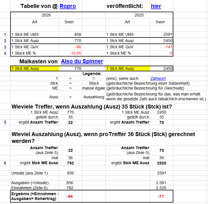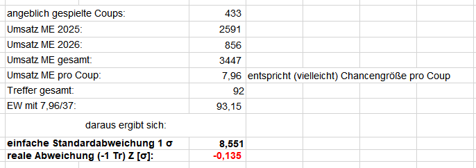 Ropro Geschrieben vor 4 Stunden Geschrieben vor 4 Stunden vor 4 Minuten schrieb Sven-DC: Hier mal die Berechnung, wie man die Trefferanzahl, aus meinen Werten ermitteln kann. aktuell sieht es heute so aus: Coup 434 Einsatz 45419 Gewinn 7026 Einsatz/Coup 104,65 Gewinn/Coup 16,18 UR: 15,46 % Man teilt den Einsatz/Coup durch den Gewinn/Coup, daraus ergibt sich der Trefferabstand, den Trefferabstand teil man durch die Coupzahl, daraus eribt sich die Anzahl der Treffer. Rechnung: 104,65 / 16,18 = 6,46 434 :6,46 = 67,18 Treffer für das gesamte Spiel ab Januar 2025 Wenn man natürlich fehlerhafte Vorlaufdaten hat, kann nur was Falsches rauskommen. Du hast seit 2025 92 Treffer.